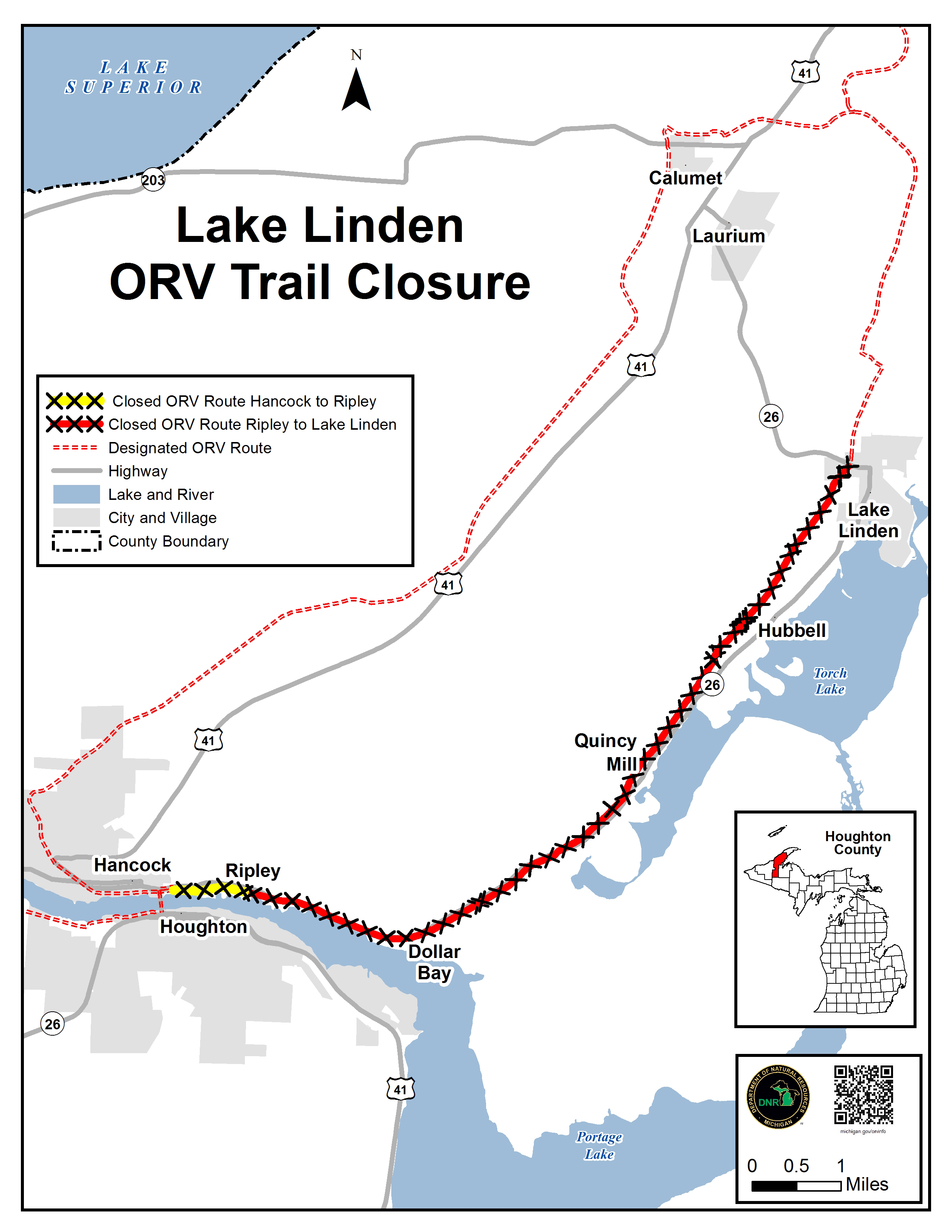 The Lake Linden Trail, between the Portage Lift Bridge and Dollar Bay, in Houghton County has been closed temporarily based on a local public health and safety advisory.