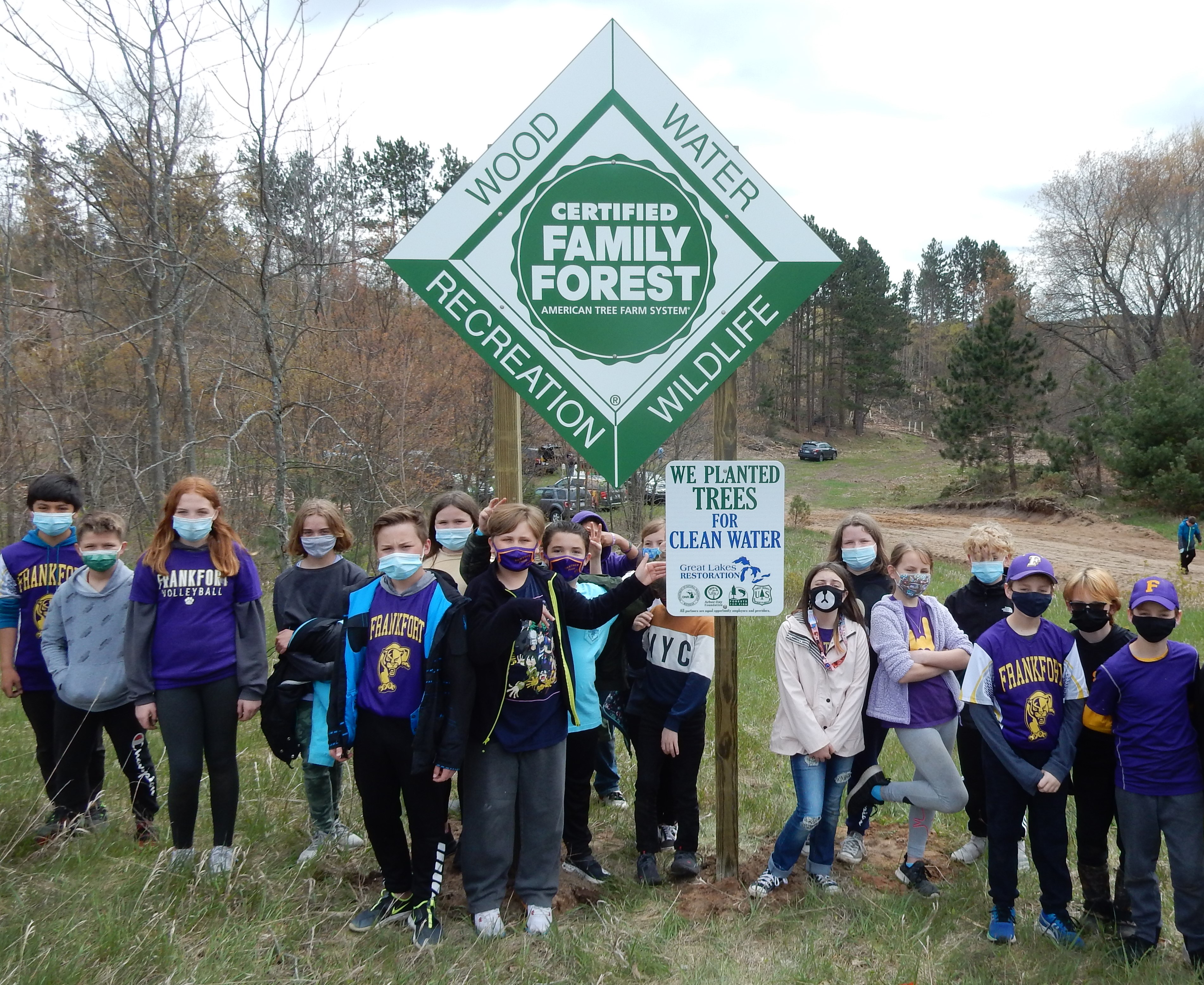 Class works together: Students from the Frankfort-Elberta school district pose for a celebratory photo after planting trees in their school forest.