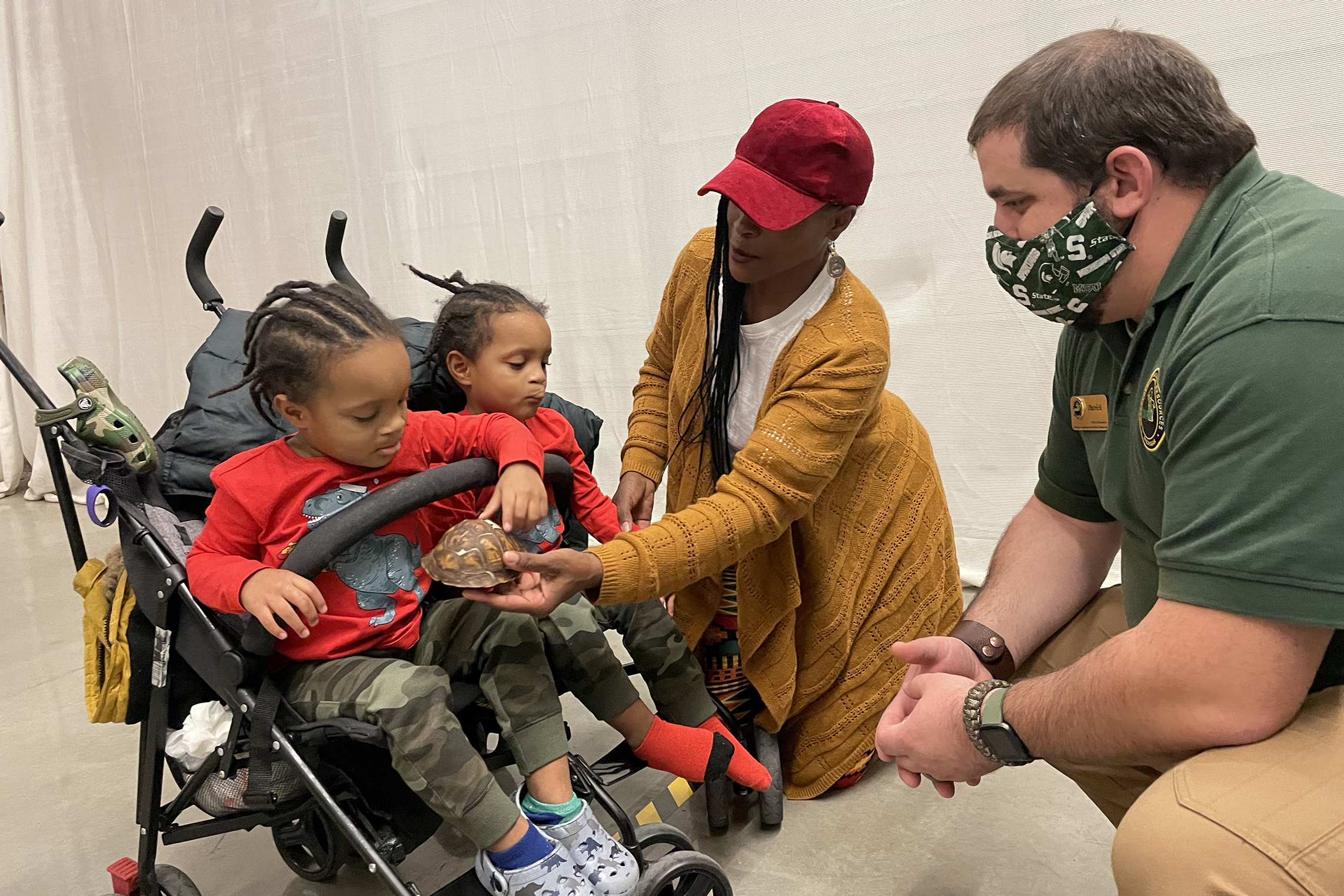 Shell and Shell2: Young Outdoor Adventure Center visitors touch a turtle shell during a recent Sensory-Friendly Days event.