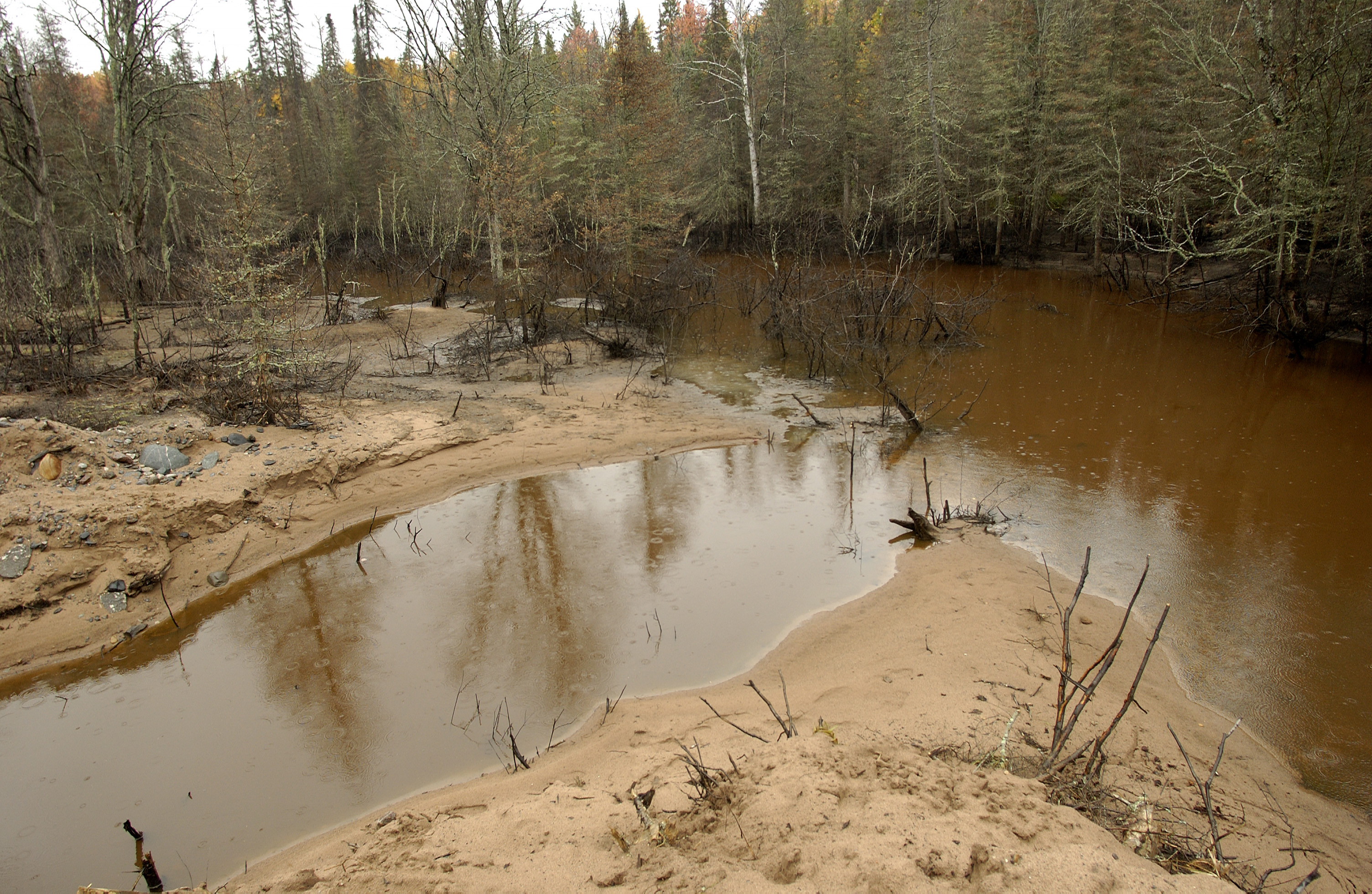 Debris from the dam and the water rushing down gradient pushed a large, brown plume of dirt, trees, garbage and other items into Lake Superior. The incident caused tremendous damage to the whole character of the stream.