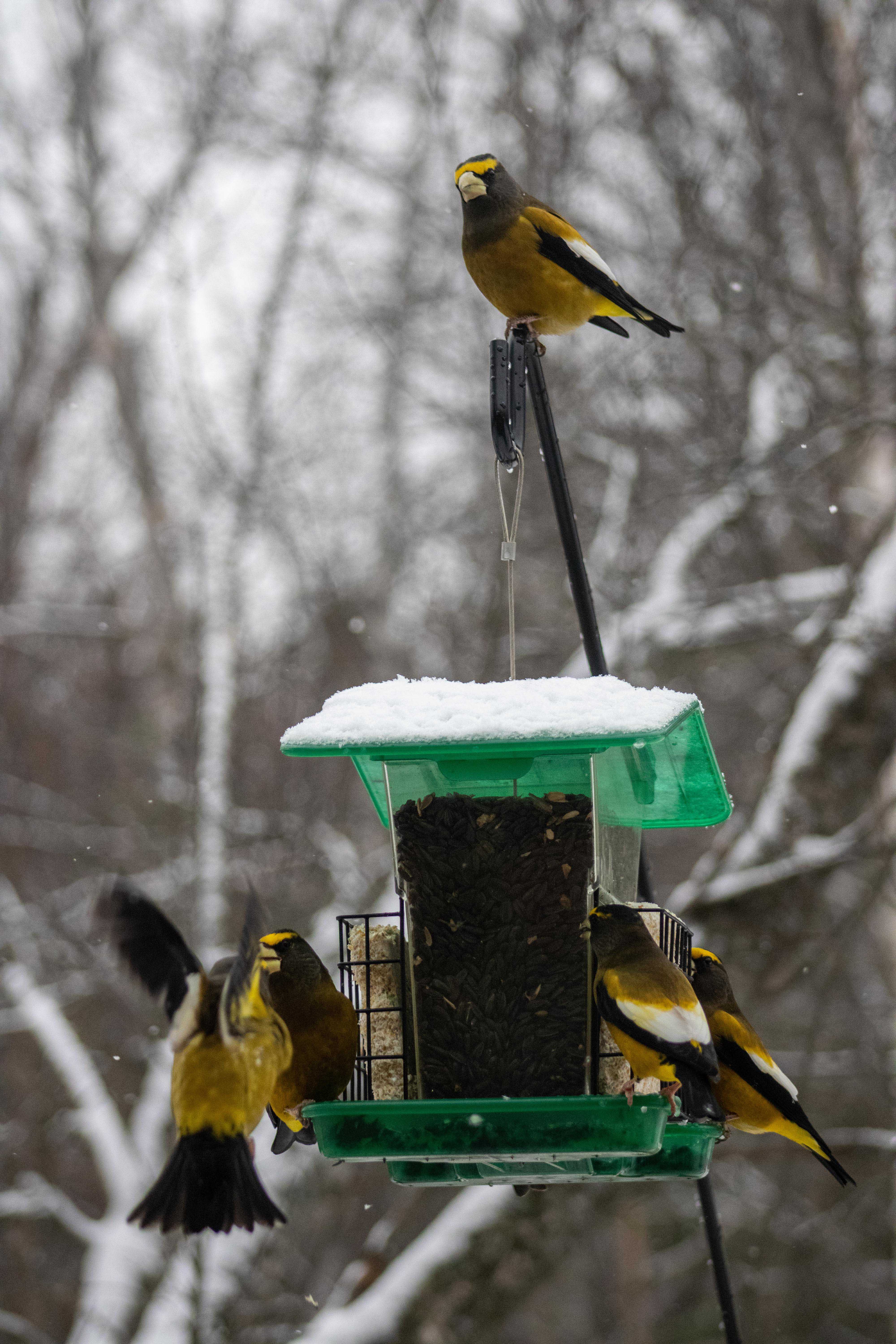 Grosbeaks: Evening grosbeaks are social birds that are usually found in flocks. In this image, a group of males are dining together at one of the author's bird feeders.