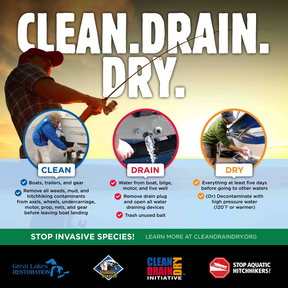 Clean, Drain, Dry: Boaters and anglers can help prevent the spread of invasive species by cleaning, draining and drying boats and gear before transporting to a new location. Infographic courtesy of "Stop Aquatic Hitchhikers."