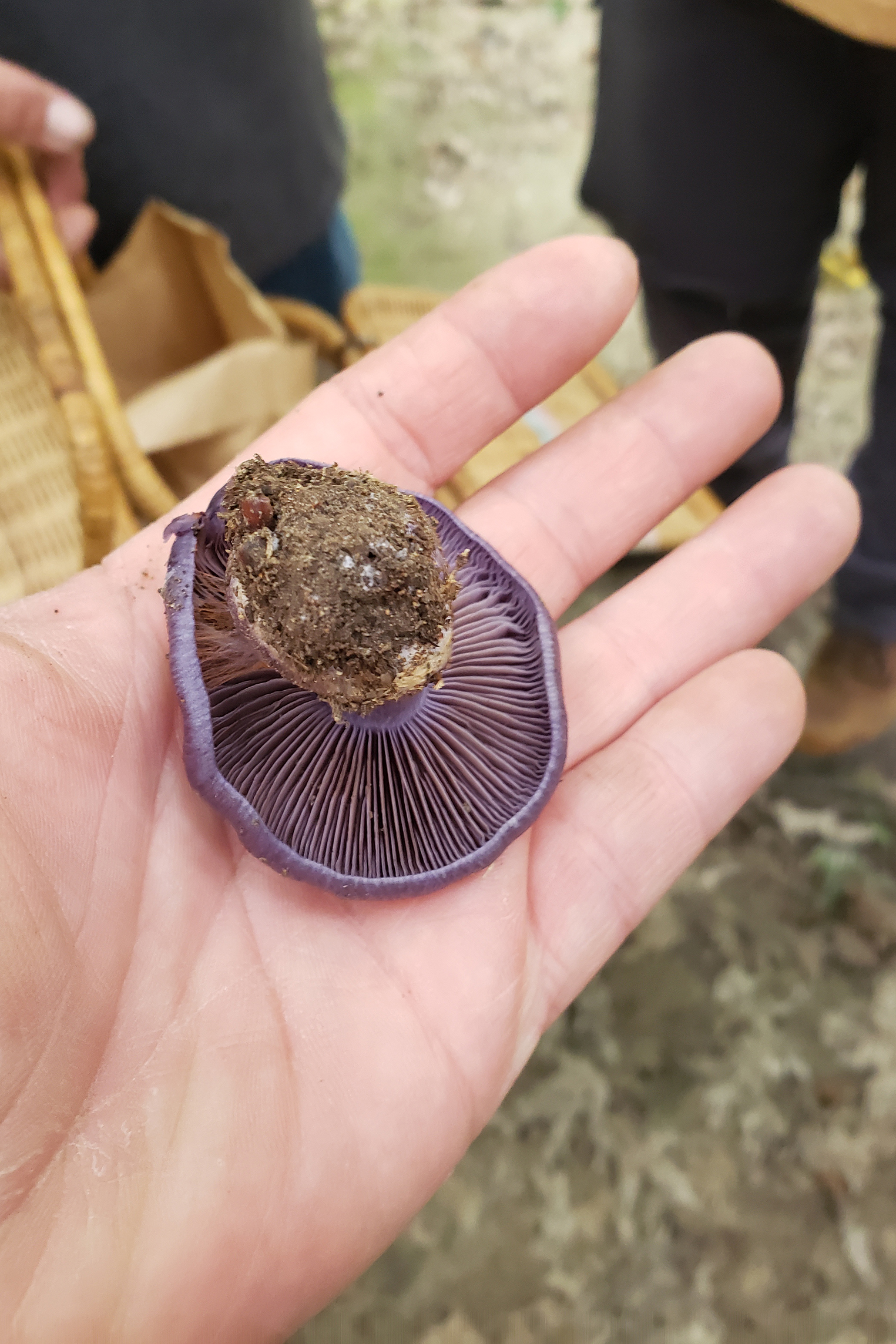 Veil: The remains of a veil covered in rusty spores on a purple specimen provided critical evidence for identification as a type of cortinarius mushroom.