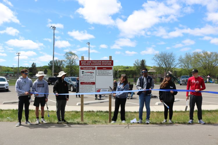 High school: 2022 grantees show off parts of their grant projects from a few summers ago! East Jordan High School (Left) displays their new aquatic invasive species decontamination sign. Photo Credit: East Jordan High School.
