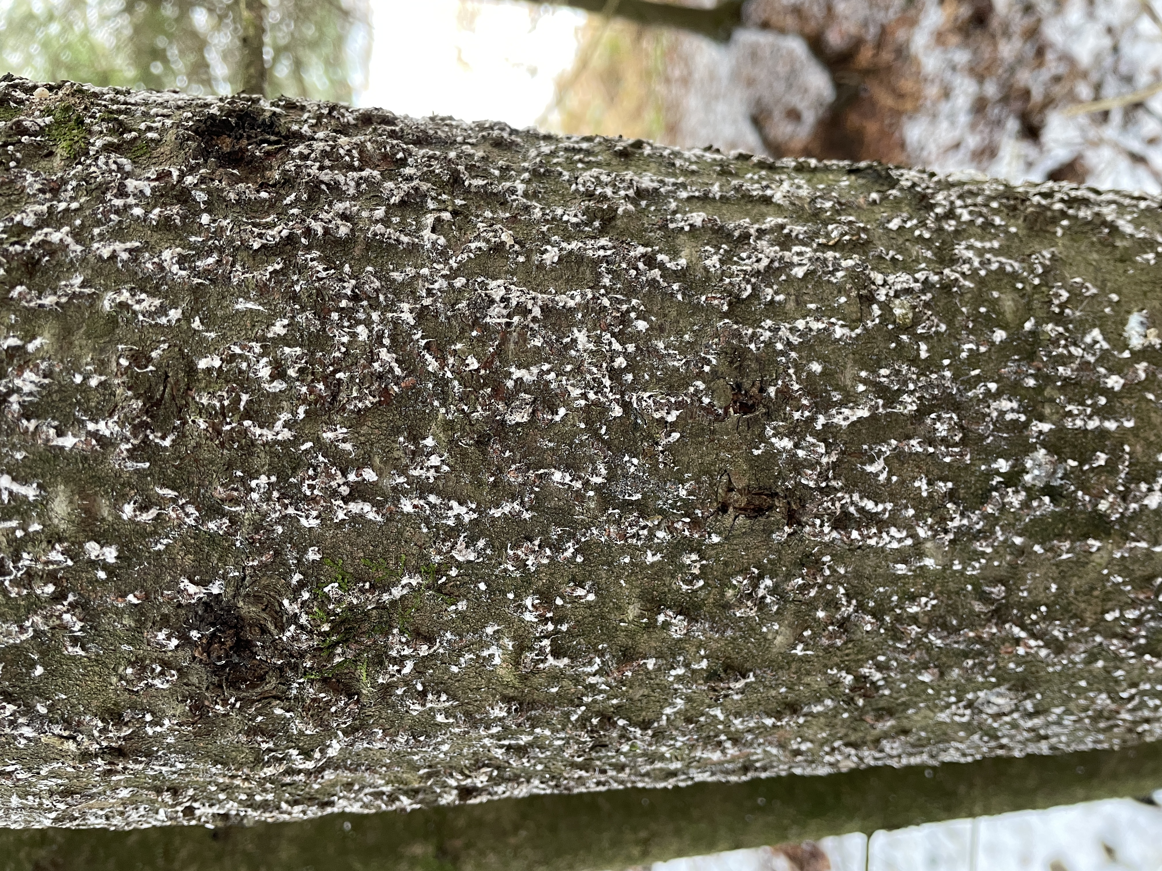BWA infestation: The trunk of a balsam fir showing characteristic woolly, white tufts caused by the balsam woolly adelgid.