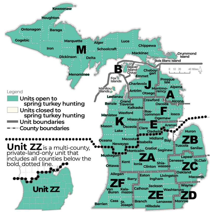 - Private lands only in the southern Lower Peninsula (TMU ZZ).