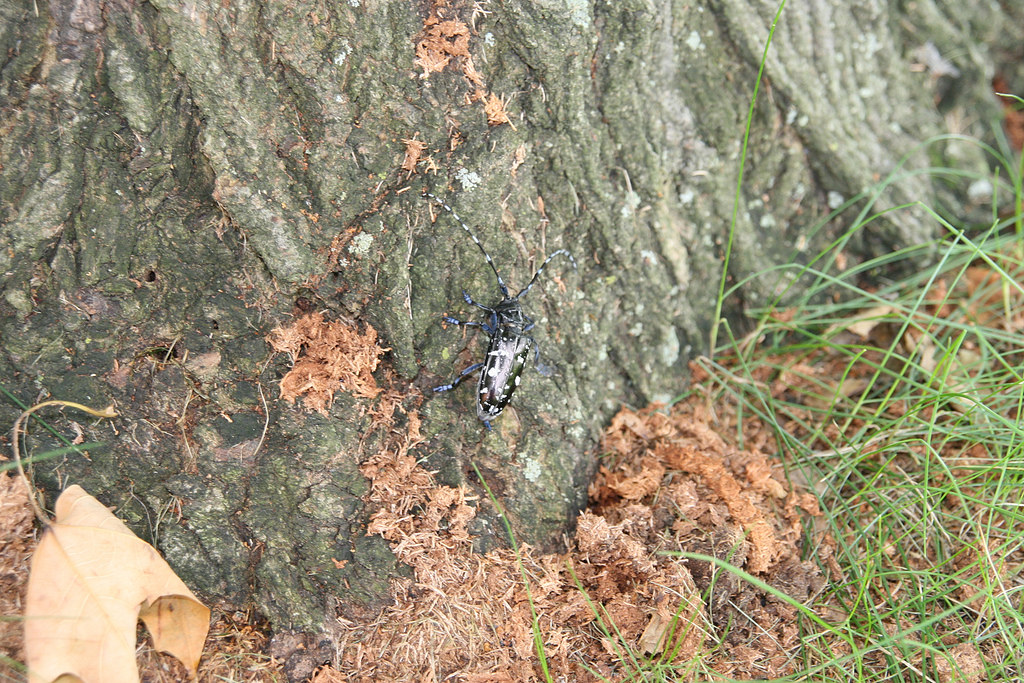 Adult and frass: Material resembling wood shavings at the base of a tree or tree branches is a sign of Asian longhorned beetle infestation. Photo courtesy of the ALB Eradication Program.