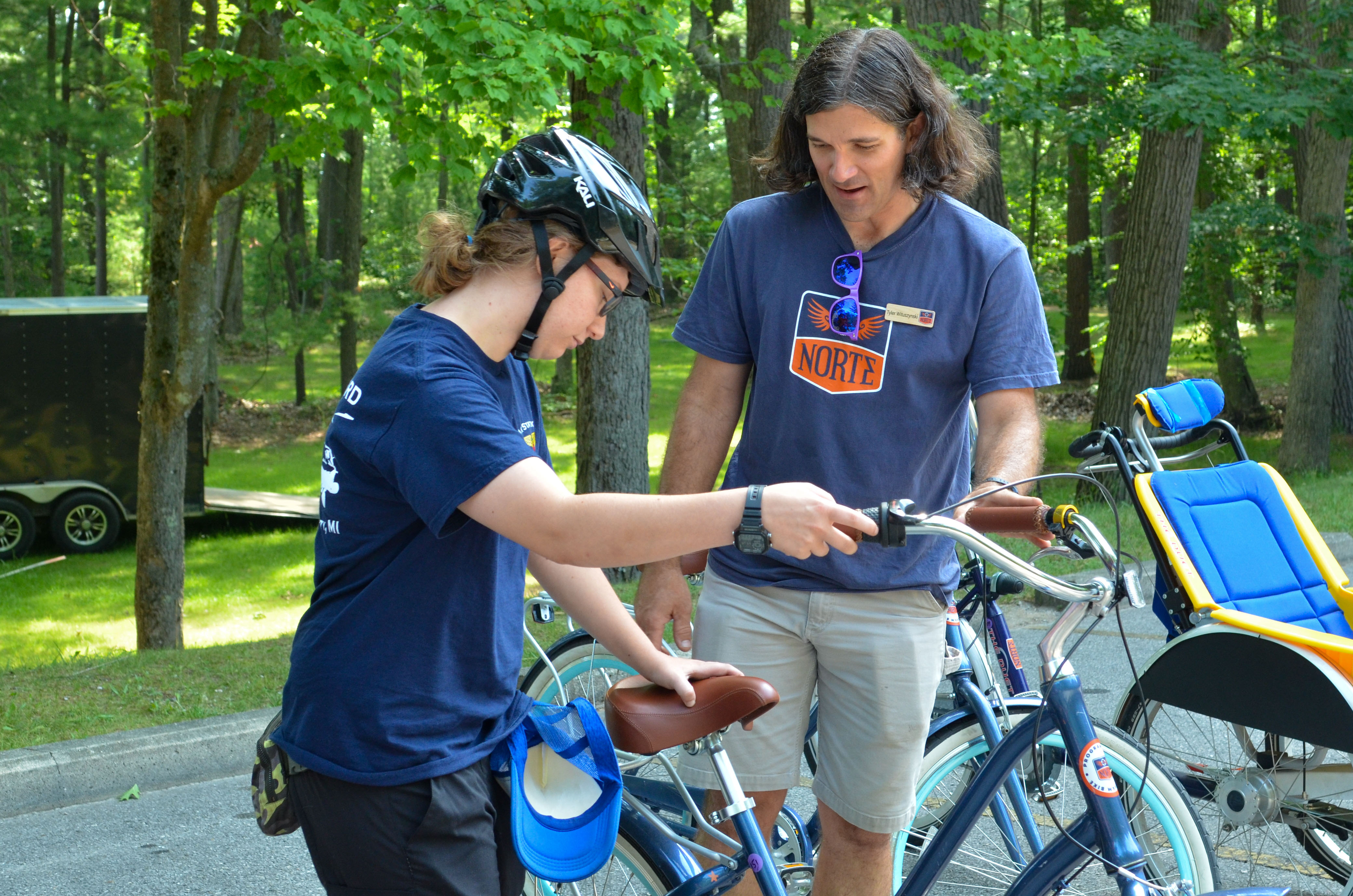 Bike: A participant at DiversAbility Day at Interlochen State Park gets ready to get on her bike.