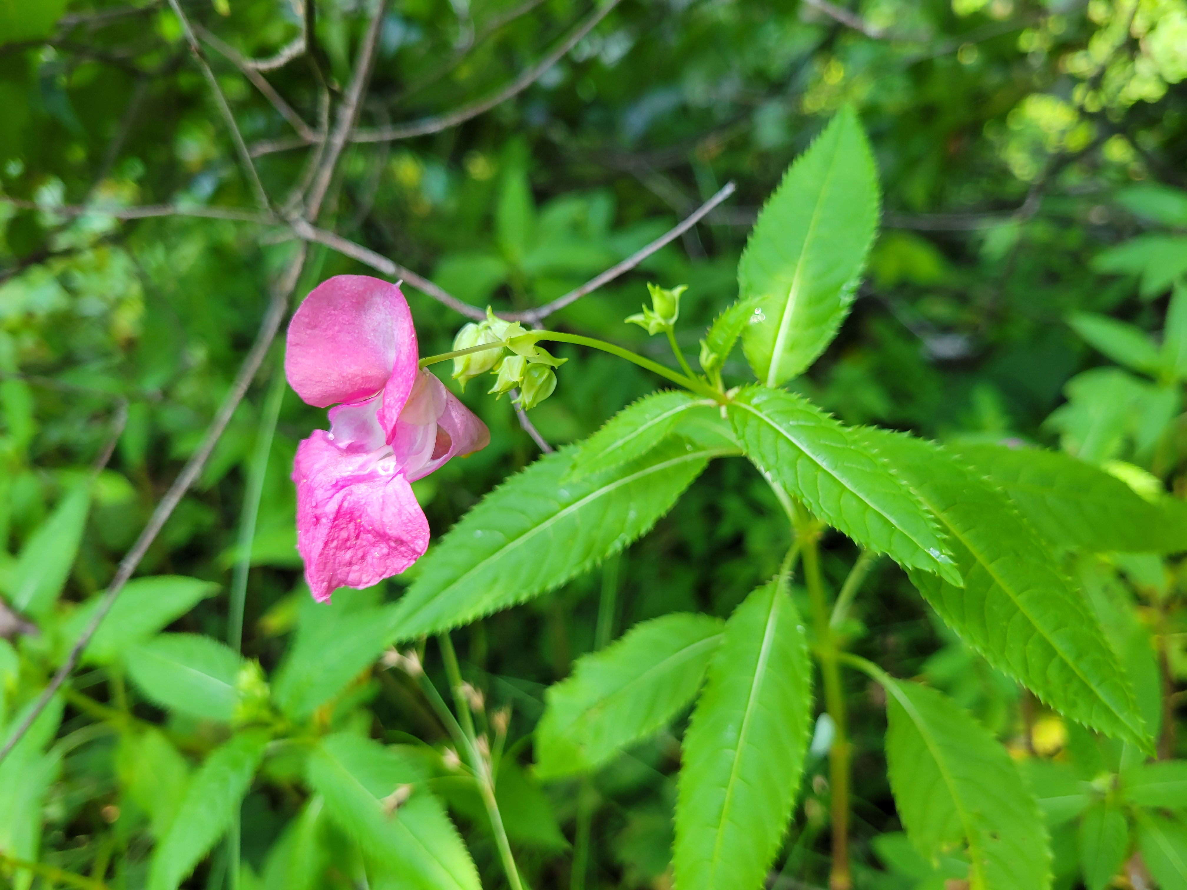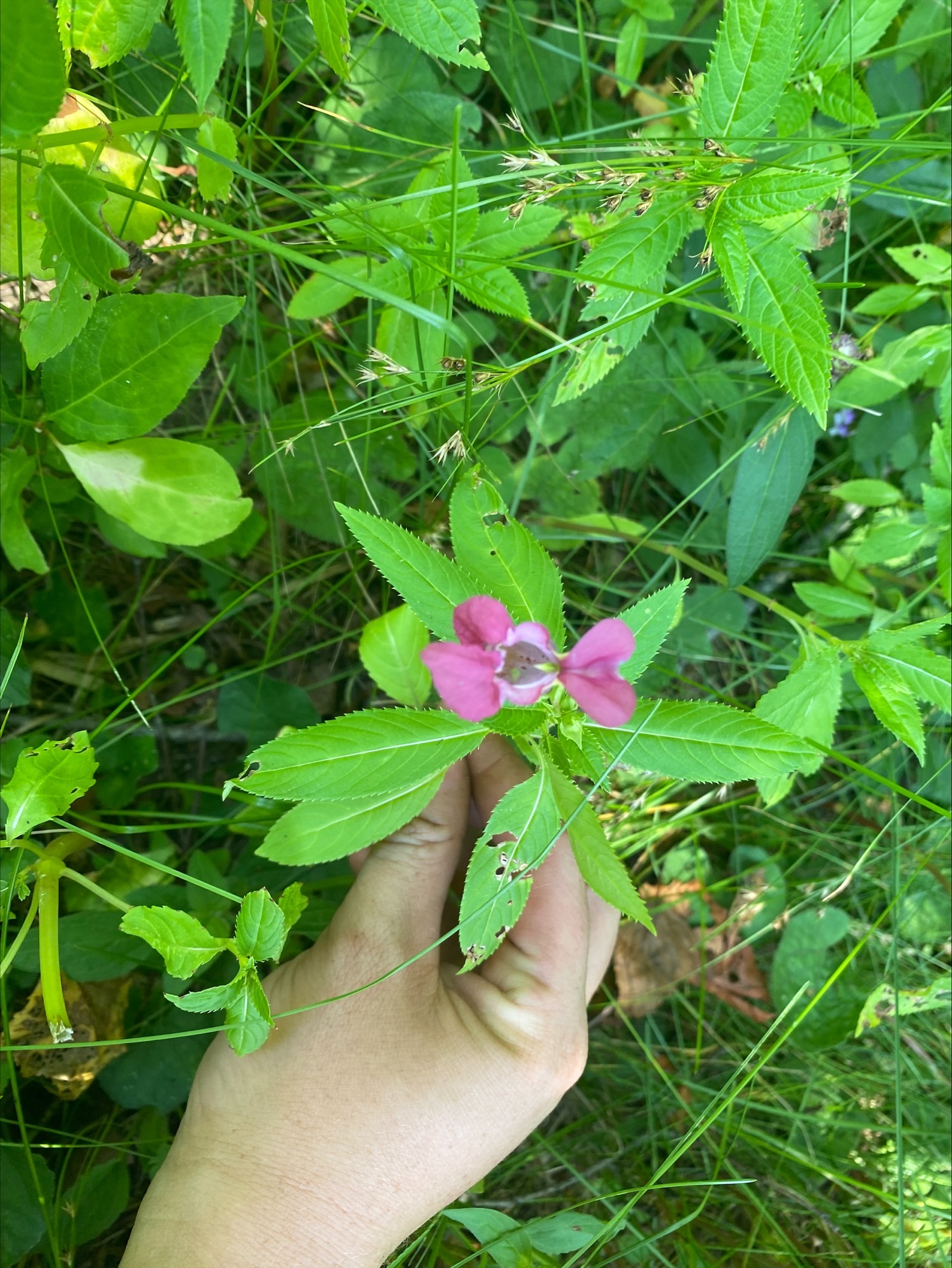 PJ: Invasive purple jewelweed has a purple to white, orchid-like flower and elongated, serrated leaves. Photo courtesy of BCK CISMA.