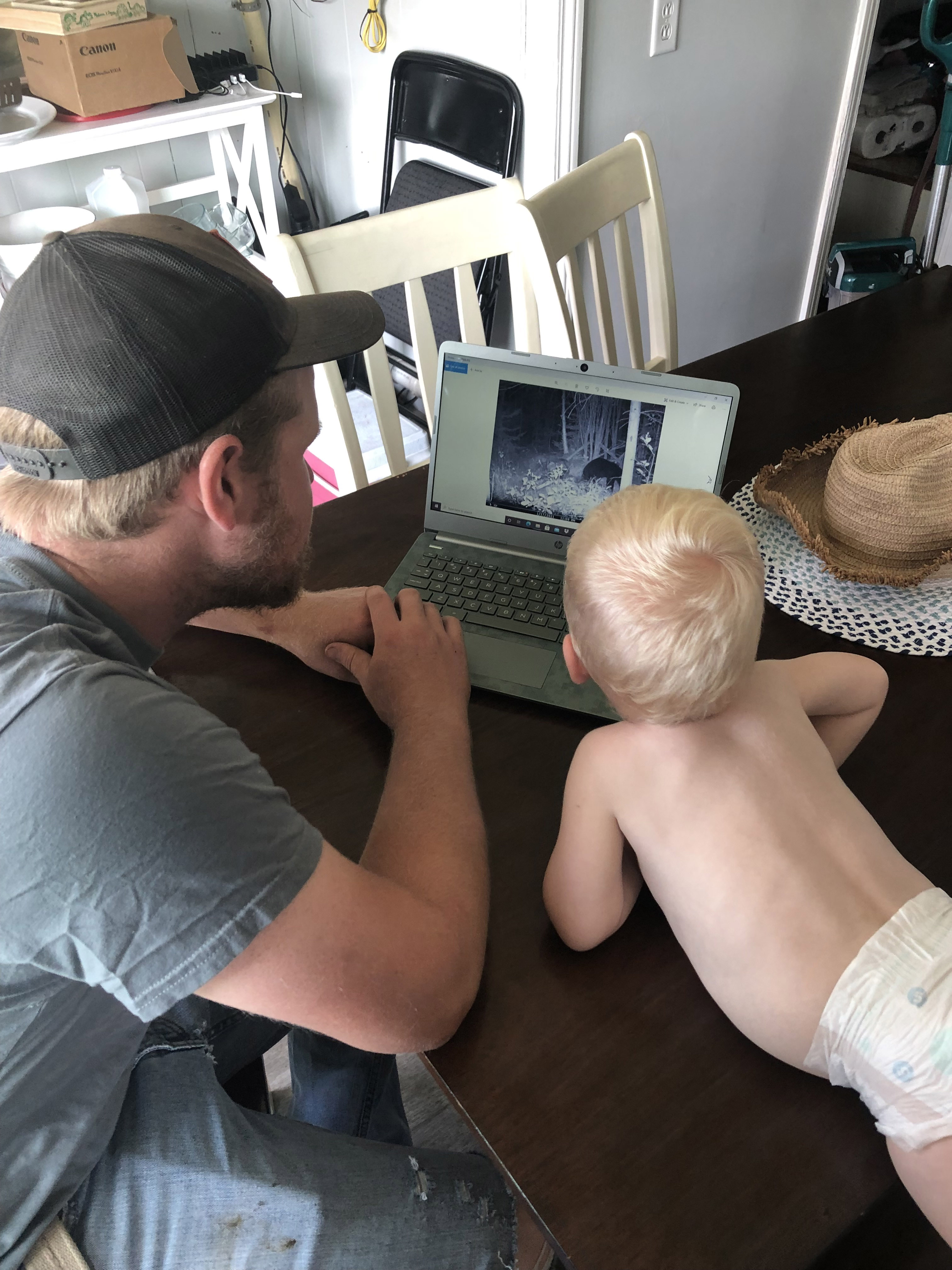 Don and Casey Brown: Don Brown and his son, 2-year-old Casey, review trail camera photos several years ago. Casey is now 5 and involved in mentored youth hunting. (Photo courtesy of Don Brown)