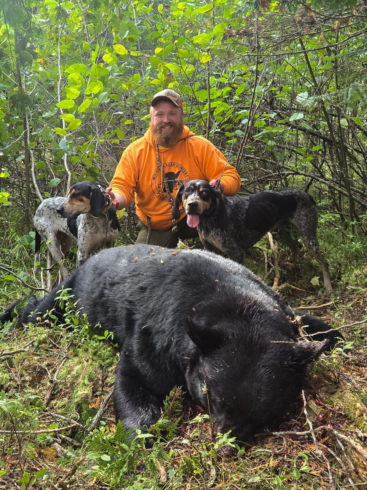 Elijah Keller harvest: Elijah Keller harvested this bear in the western U.P. in October 2024 with help from hounds Gabby (left) and Poncho. The bear was about 350 pounds when field dressed. (Photo courtesy of Elijah Keller)