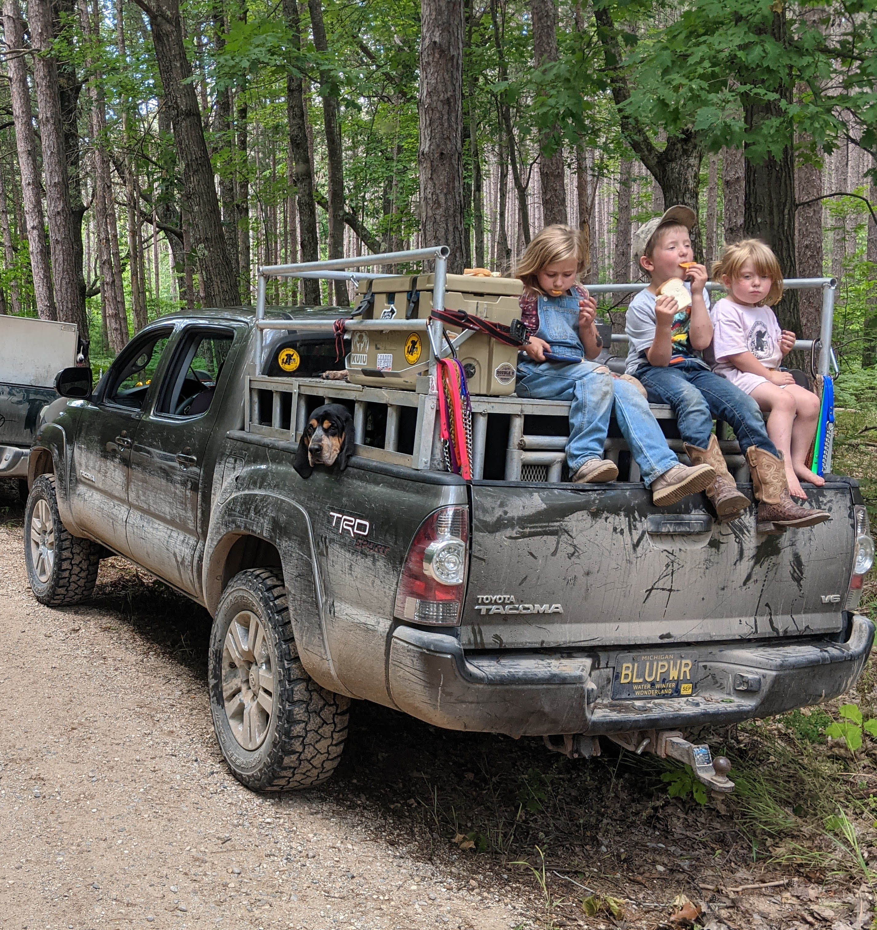 Keller family: The kids take a lunch break on Elijah Keller’s truck during a bear hunting training run. From left is Zella, a family friend, and Anders and Ada – two of Keller’s three children. (Photo courtesy of Elijah Keller)