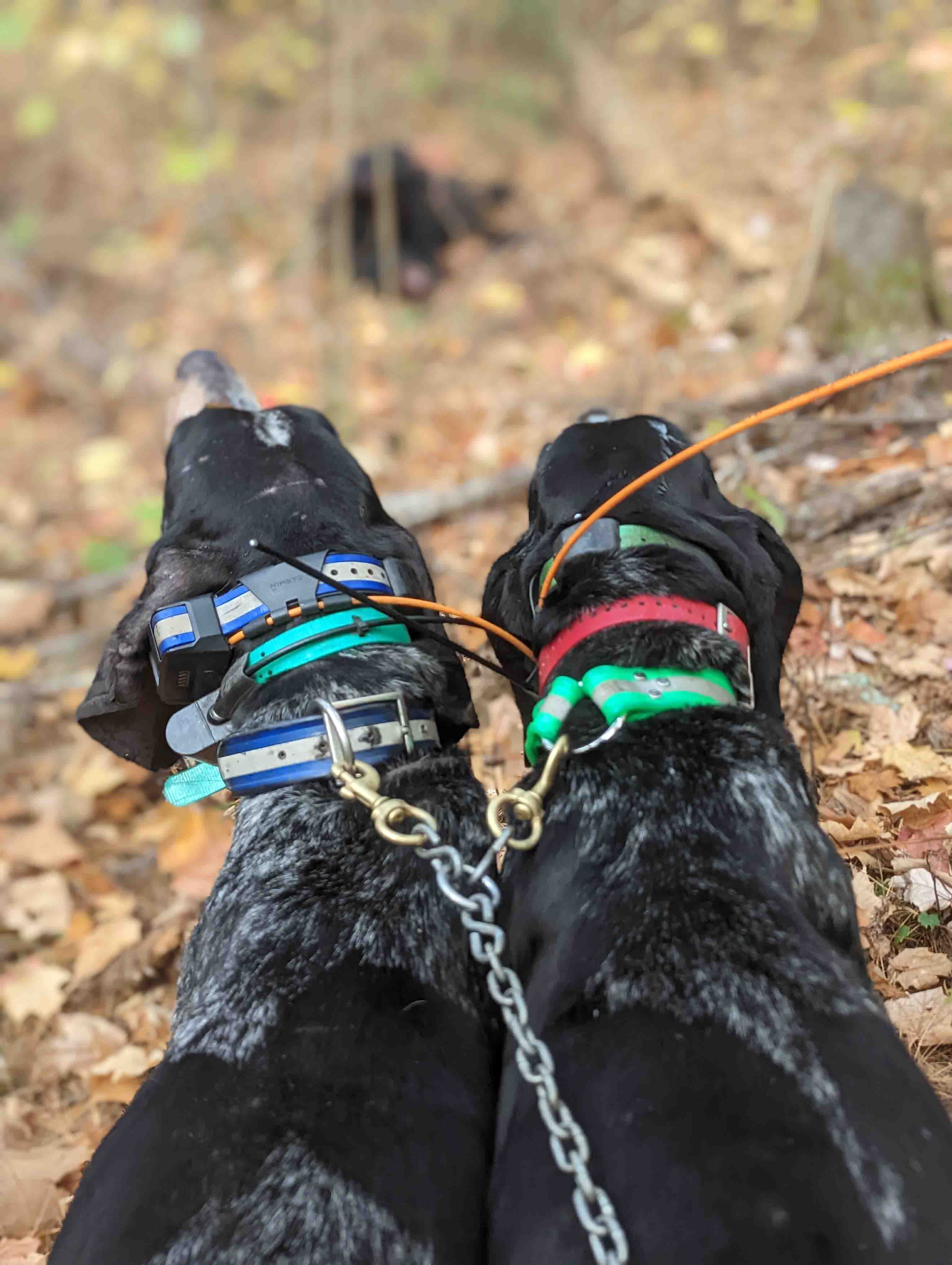 On the trail: Elijah Keller and two of his dogs (Poncho, left, and Hatchet) are hot on the trail of a black bear they eventually harvest in the western Upper Peninsula. (Photo courtesy of Elijah Keller)