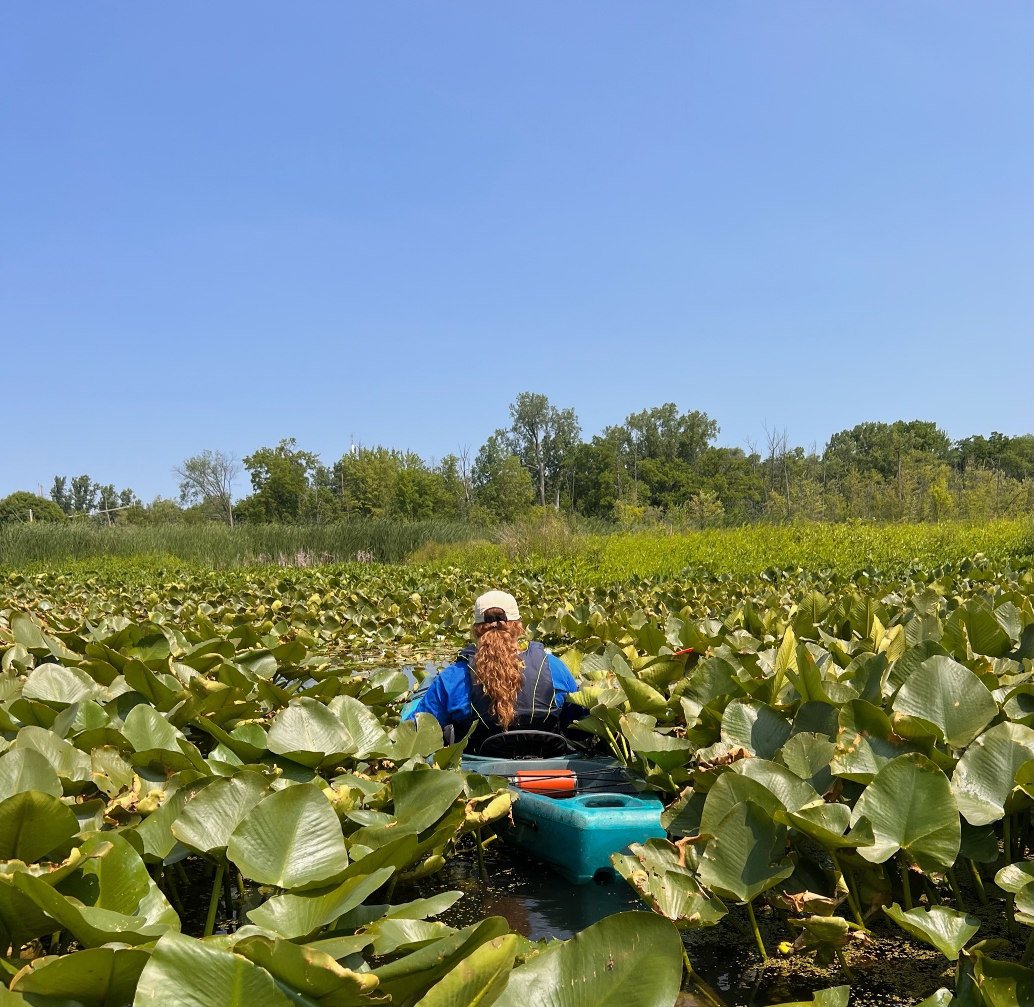 AIS kayak: A CISMA staff member conducts an aquatic invasive species survey in a kayak.