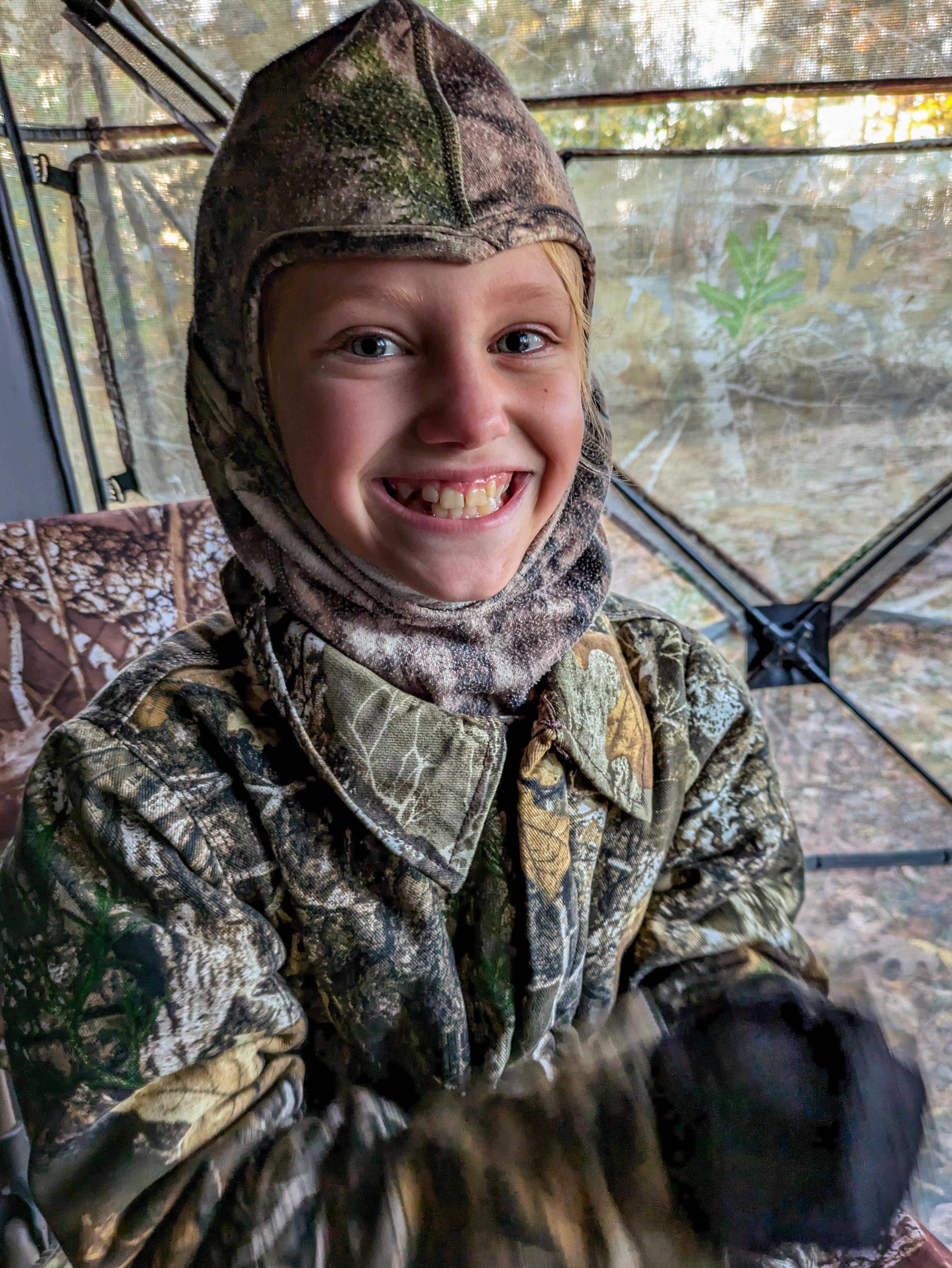 Olive Dean in blind: Olive Dean smiles while waiting in a deer blind during the November 2024 firearm deer season. (Photo courtesy of Lyndsay Dean)