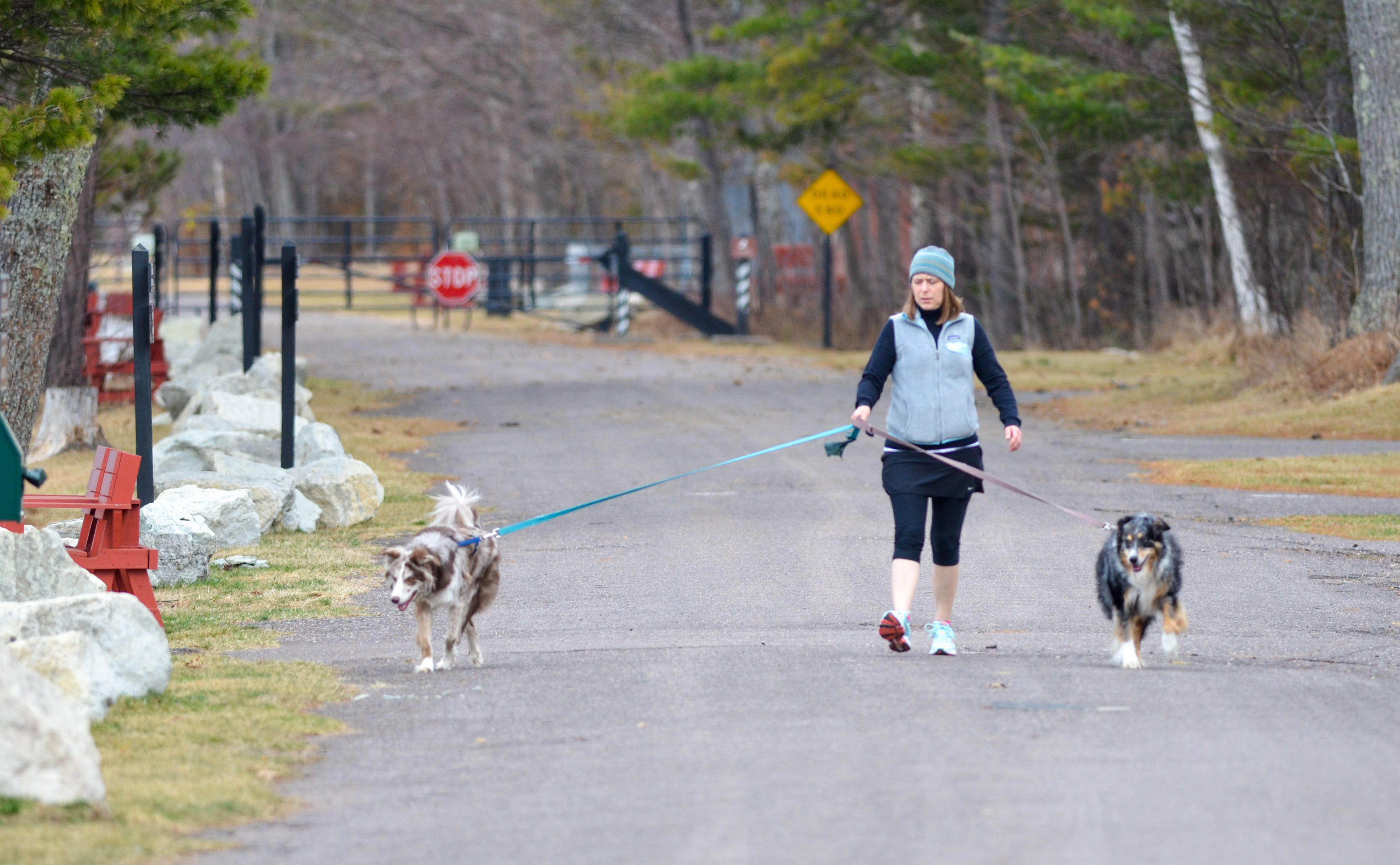 McLain: A woman walks her dogs along a trail at F.J. McLain State Park in Houghton County.
