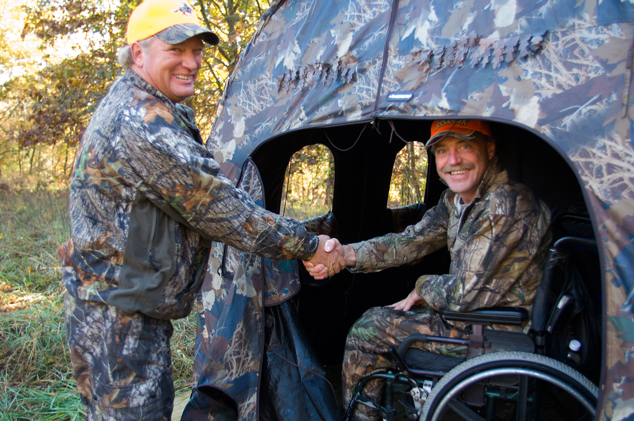 Hunters: Two hunters shake hands in the field. A growing number of hunters are donating to help Hunters Feeding Michigan.