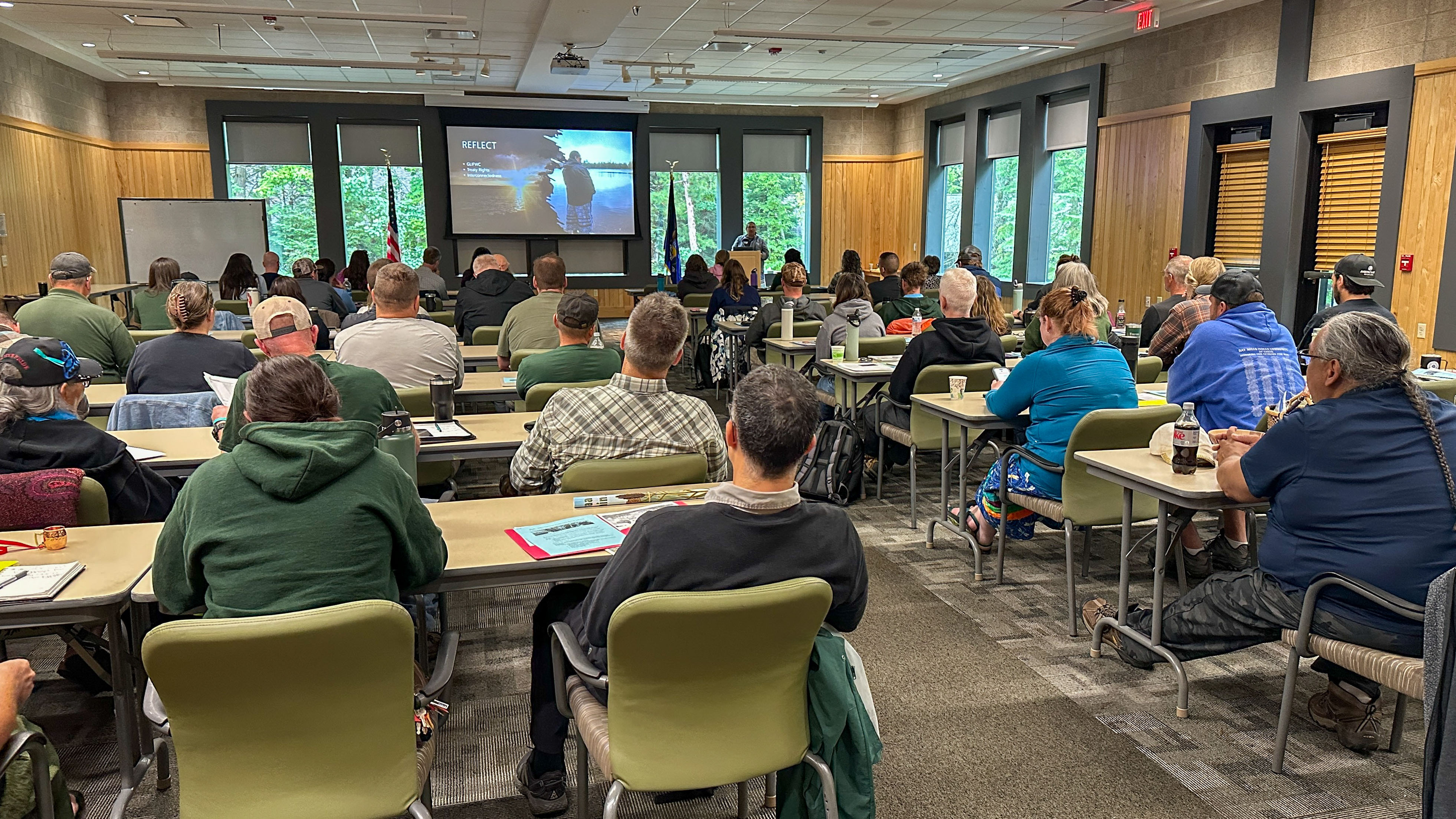 Fifty-eight people attended the DNR’s two-day manoomin camp at the Ralph A. MacMullan Conference Center in Roscommon, where tribal instructors led sessions focused on ceremony and traditional teachings that included harvesting tools, seed care and processing. The instructors represented the BMIC, KBIC, Saginaw Chippewa Indian Tribe, Little River Band of Ottawa Indians, Cree Nation and Gun Lake Tribe.