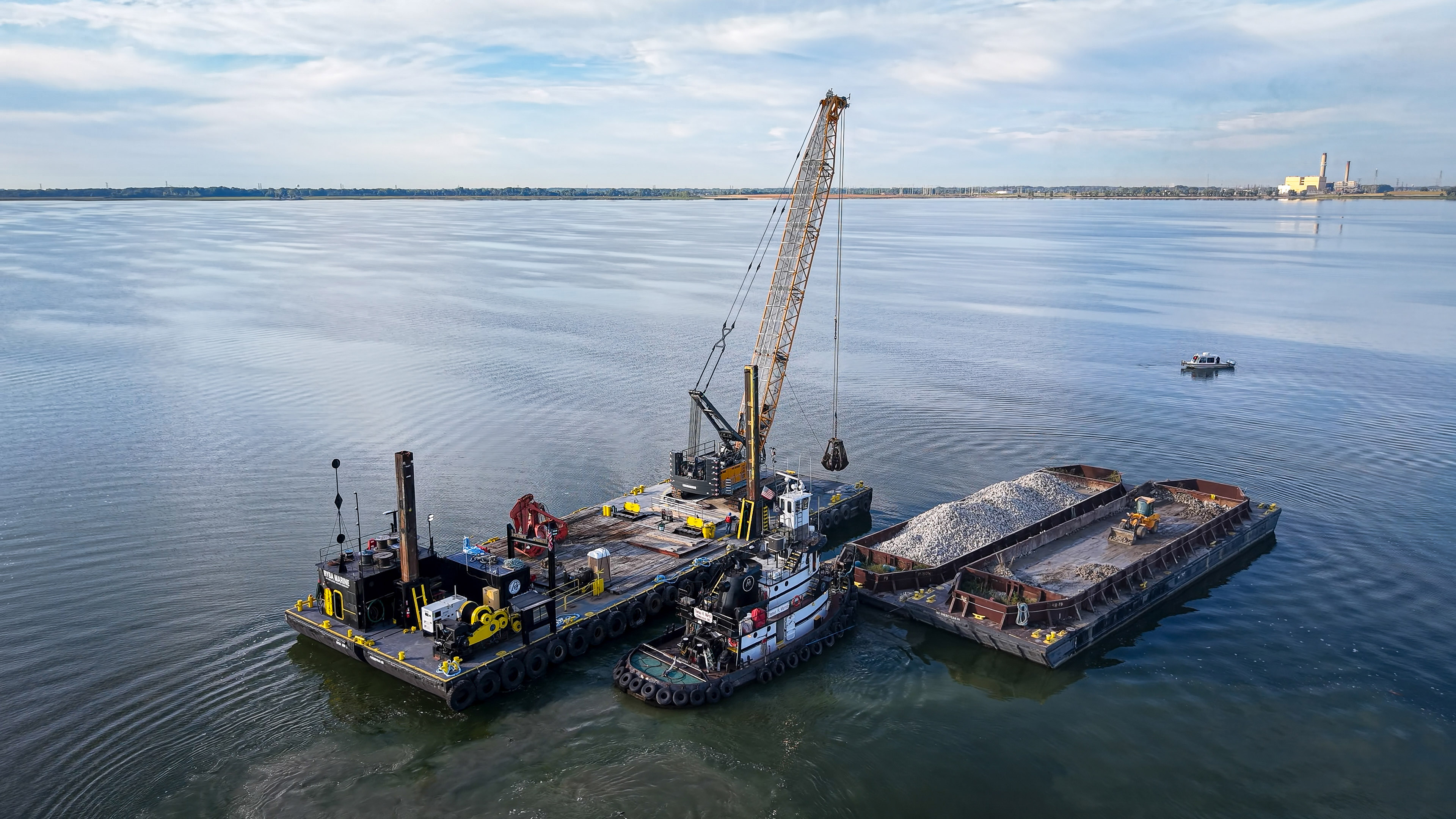 The process for building the reef was straightforward: Pieces of limestone, quarried locally in the Thumb area of Michigan, were moved out to the reef location on barges. A crane, also on a barge, used a claw to pick up the stone cobble and drop it into place.