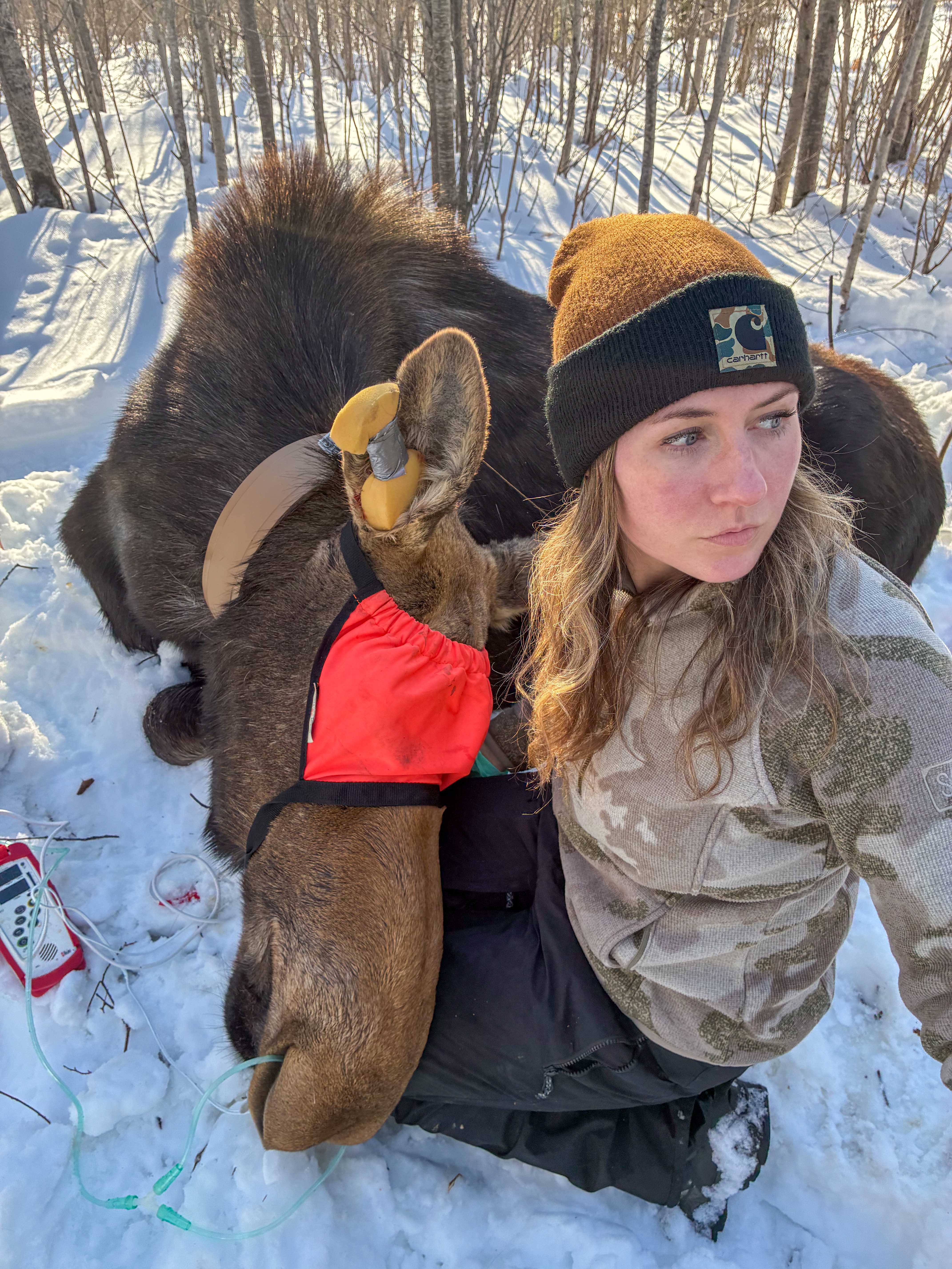 Moose-1: Michigan Department of Natural Resources wildlife biologist Angela Kujawa monitors a moose under sedation as part of a western U.P. research project in mid-February. Researchers captured, collared and released 41 moose.