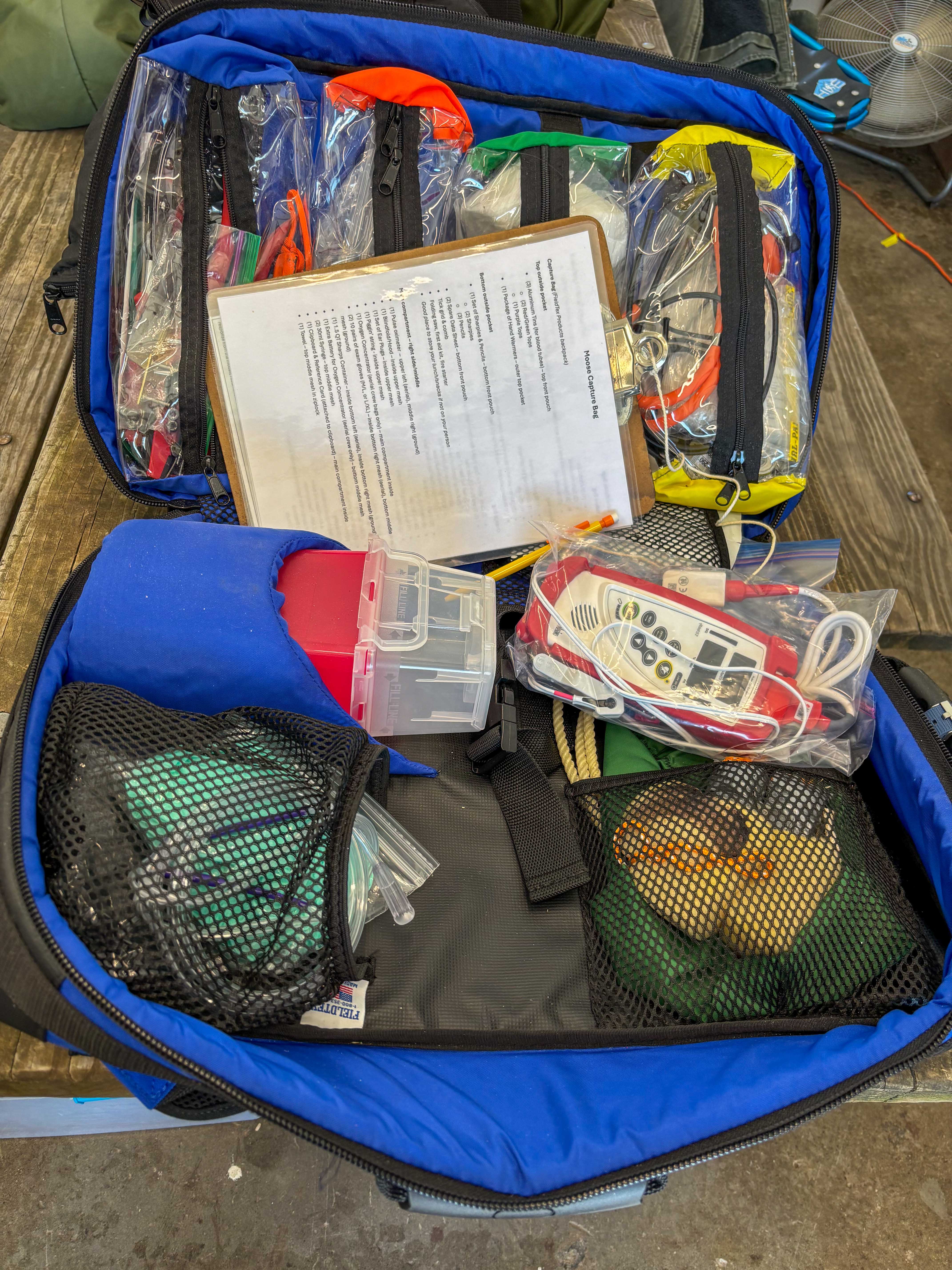 Moose-7: A field pack for monitoring moose includes a pulse oximeter, drugs to reverse sedation and various other supplies.