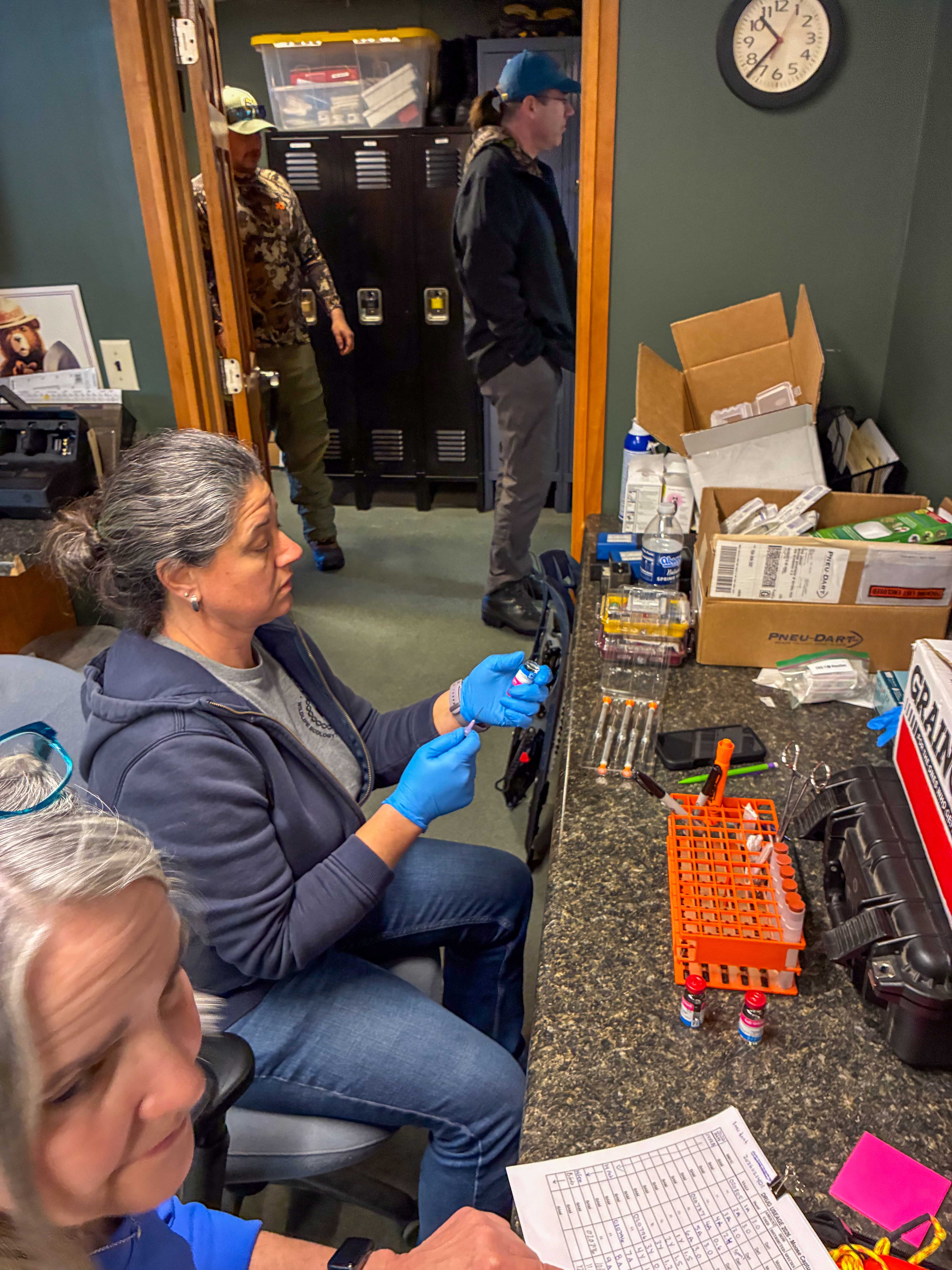 Moose-4: Erin Largent, a Michigan Department of Natural Resources wildlife research technician, prepares drugs for moose at the Van Riper State Park headquarters as part of a four-day capture-and-collar research effort.