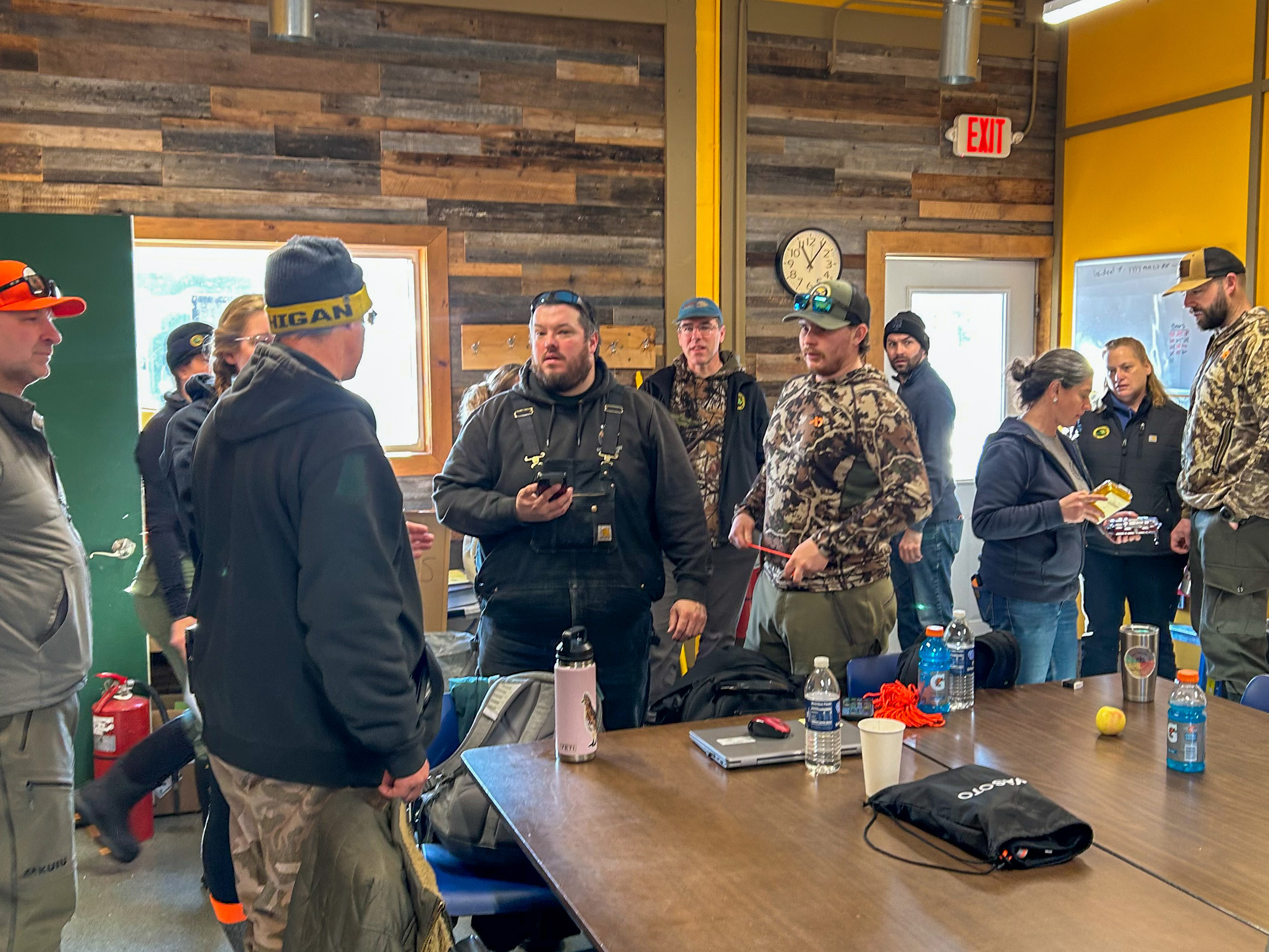 Moose-8: A collaborative research crew attends a safety meeting at Van Riper State Park. The crew included wildlife experts from the Michigan Department of Natural Resources, Keweenaw Bay Indian Community, Northern Michigan University and other organizations.