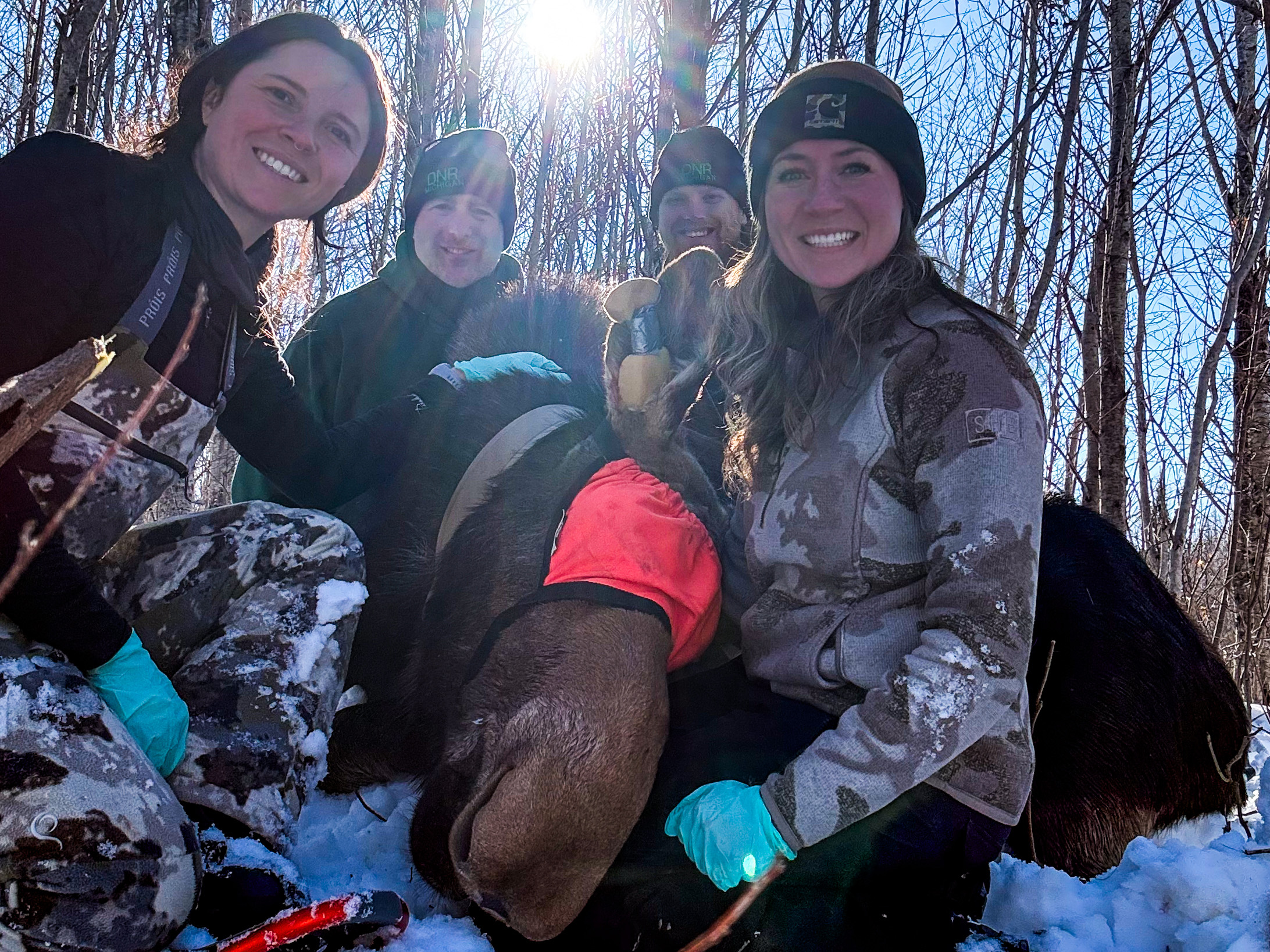Moose-11: A team of Michigan Department of Natural Resources wildlife biologists poses with a sedated moose in the western U.P. From left are Morgan Lucot, Clay Buchanan, Don Brown and Angela Kujawa.