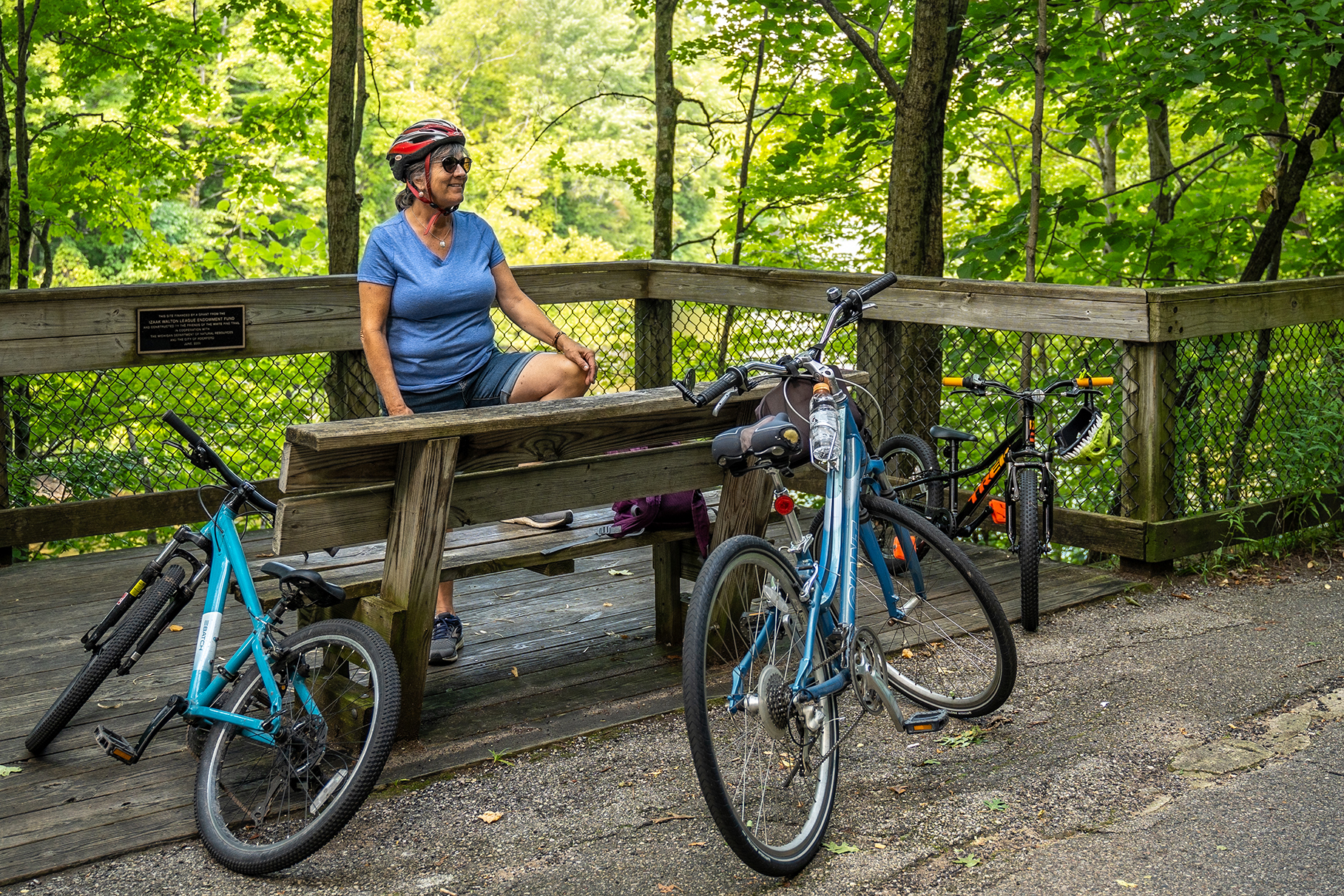 Trail amenities include benches, picnic pavilions, repair stations, a gazebo with benches, seasonal port-a-johns, pit toilets, river overlooks and a water fill station. The trail passes by parks with picnic tables, benches, municipal restrooms and playground equipment.