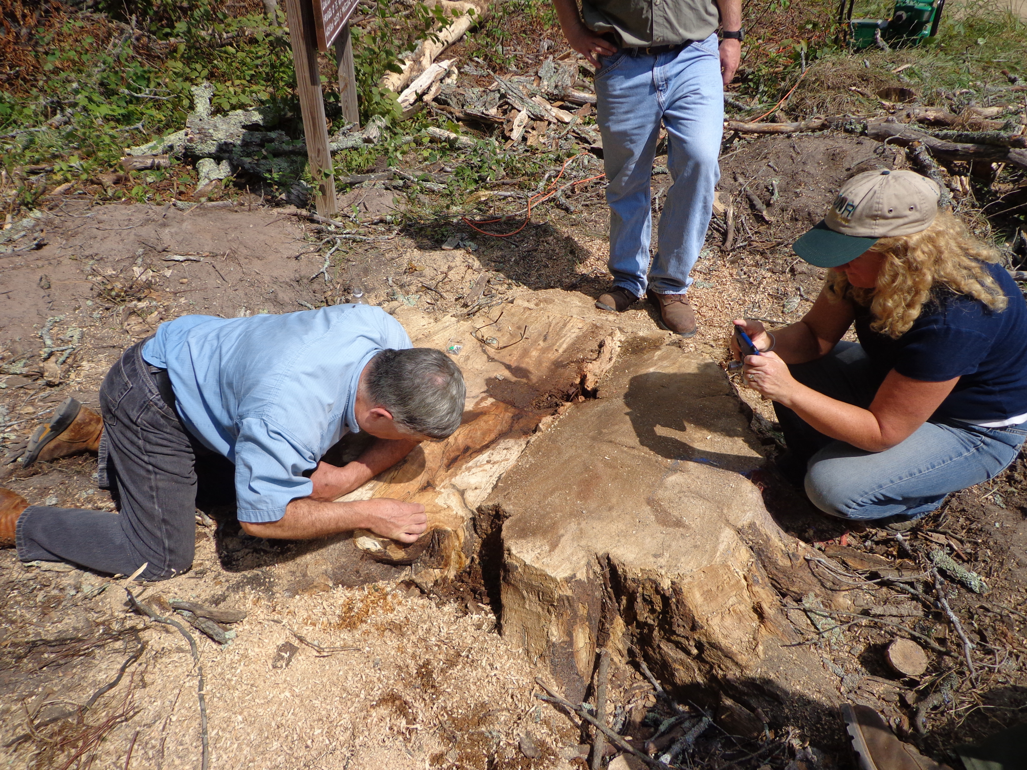 Witness tree3.jpg – Jerry Grieve, a DNR land use forester, examines the stump of the witness tree. After counting the sugar maple’s rings, Grieve estimates the tree to have been 200-plus years old.