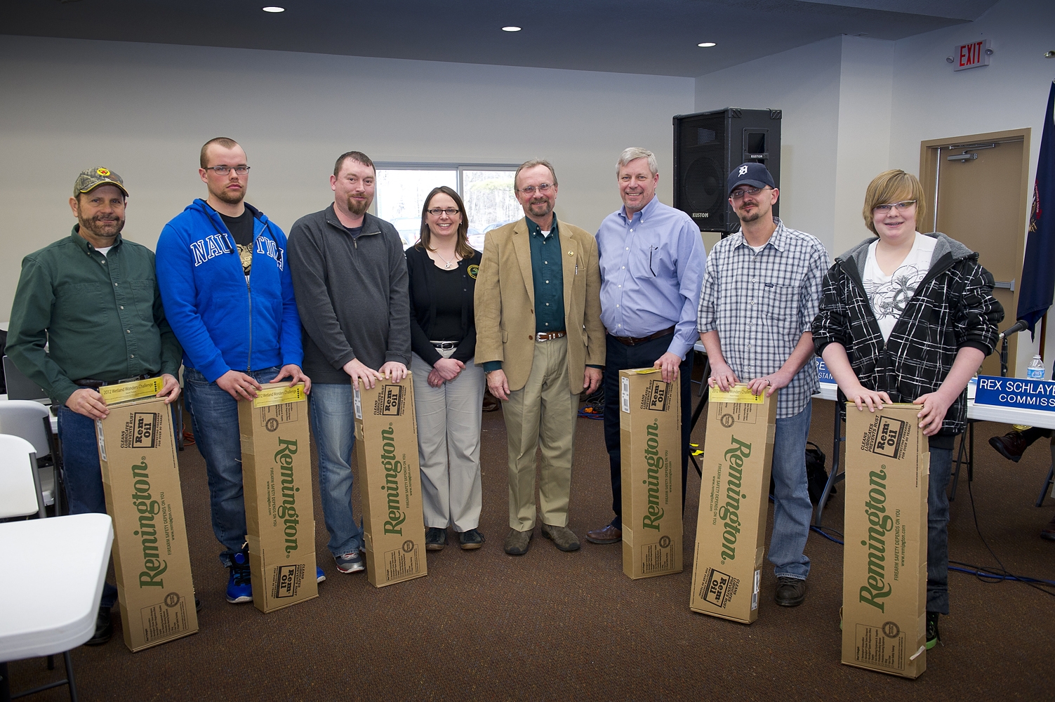 Six of the seven Michigan waterfowl hunters randomly chosen as the first winners of the Department of Natural Resources' Wetland Wonders Challenge – Triston Bradshaw of Allegan, Michael Schindler of Bay City, James Graves of Rhodes, Isaiah Battel of Cass City, Thomas Bauer of Clarkston and Gary Van Kirk of Swartz Creek – received their prizes March 14 at the regular monthly meeting of the Natural Resources Commission in Saginaw. (The seventh winner, Lupe Martinez of Hamilton, could not be present at the meeting and has since received his prize package.)