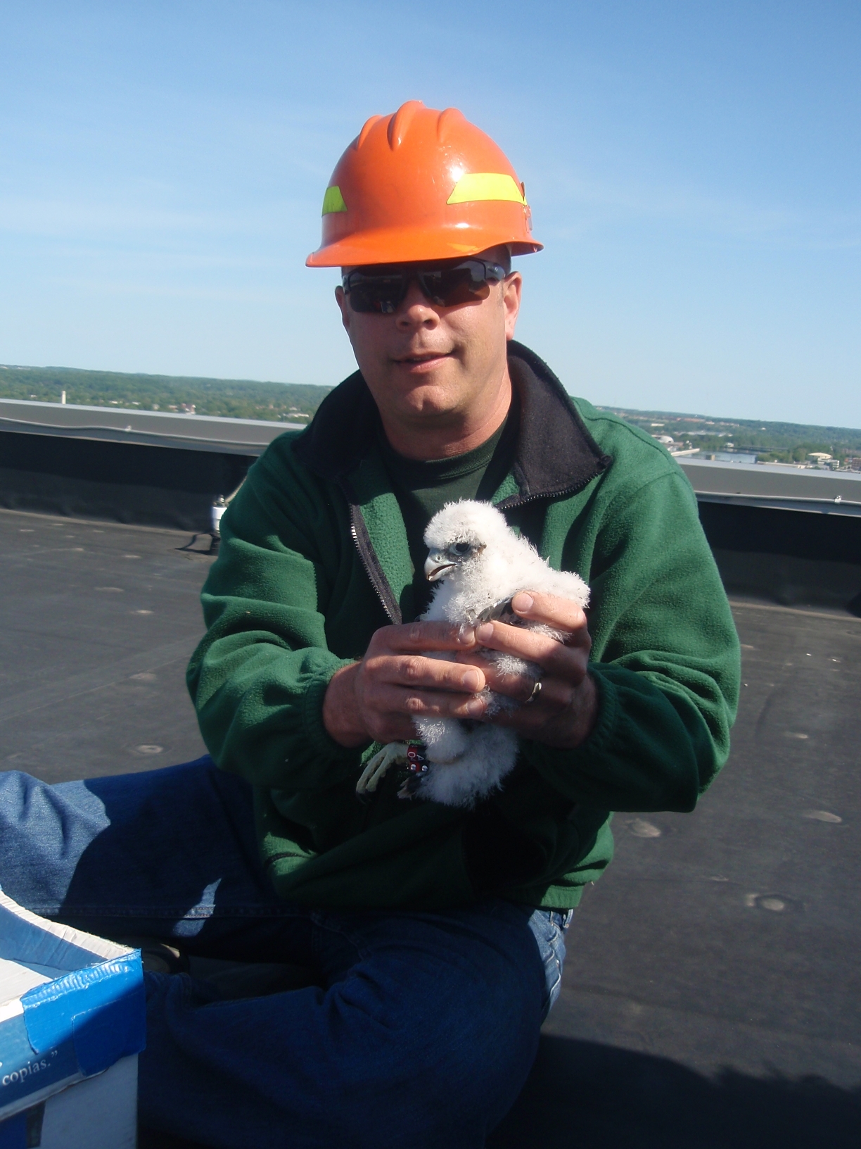 John Niewoonder, Department of Natural Resources wildlife supervisor, recently helped band two peregrine falcon chicks that nest on top of the Kent County Courthouse in Grand Rapids./