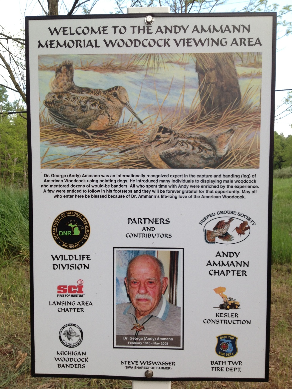 A gentle rain fell Thursday evening, June 6, as family, friends and fellow sportsmen gathered to remember Dr. George (“Andy”) Ammann, former grouse and woodcock biologist for the Michigan DNR, and to dedicate the newly created Andy Ammann Memorial Woodcock Viewing Area at the DNR Rose Lake Wildlife Research Area in Clinton and Shiawassee counties.