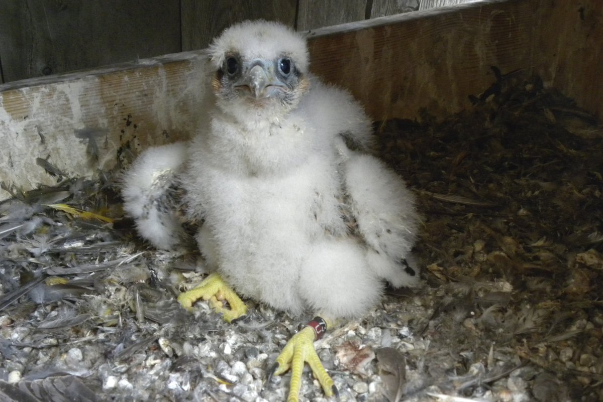 At about three weeks of age and before they can fly, peregrine falcon chicks are given two bands on their legs – one bi-colored band with large numbers that can be read from a distance and a U.S. Fish and Wildlife Service Band, which is usually purple and bears a serial number specific to that bird. These bands are placed on young birds so that scientists can monitor and track the dispersal, migration, life span, reproductive success, behavior and population growth of the falcons.