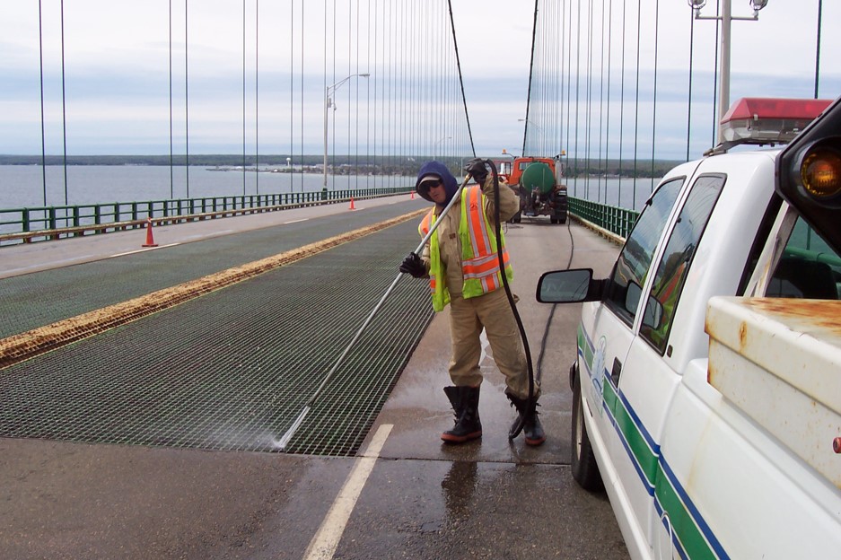 1 – Cleaning the Mackinac – Each spring, Mackinac Bridge Authority (MBA) employees sweep and wash off sand and road salt that is tracked onto the bridge and accumulates in nooks and crannies each winter. (MBA photo)