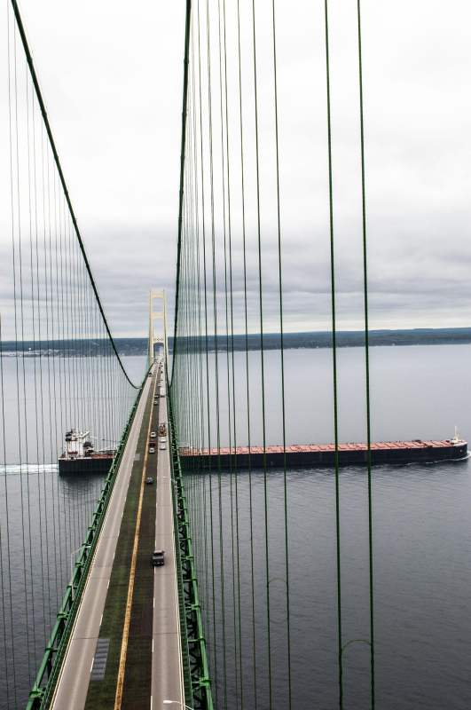 6 – Mackinac Bridge with freighter – Once the ice is gone, people crossing the Mackinac Bridge can watch freighters as they pass beneath between Lake Michigan and Lake Huron. (MDOT photo)