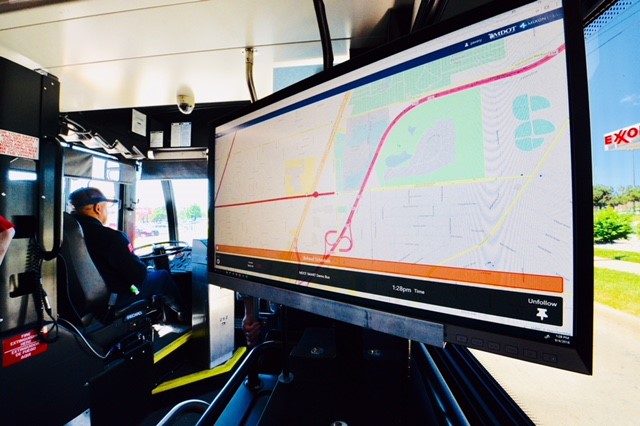 Computer monitor shows vehicle to infrastructure software being tested on SMART bus on M-97. (MDOT Photo)