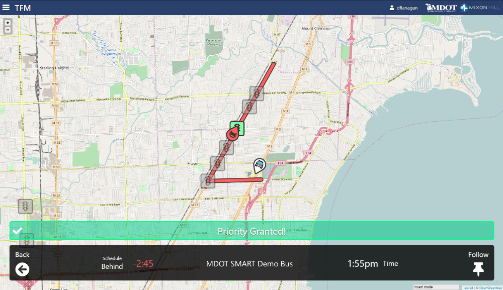 Screen image from vehicle to infrastructure software being tested on SMART bus on M-97.