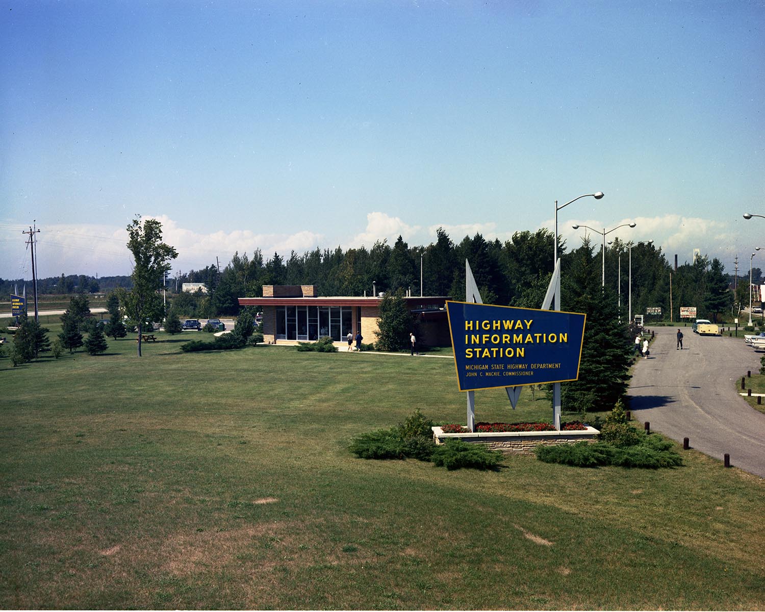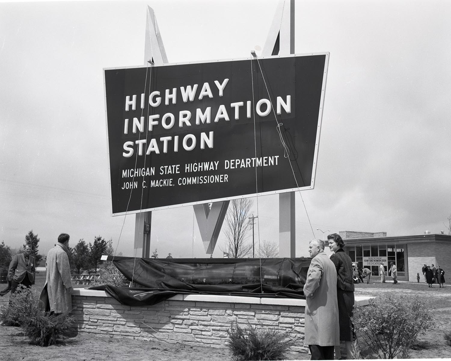 Mackinaw City Welcome Center sign circa 1959.jpg – A photo of the Highway Information Station sign when unveiled at the new Mackinaw City Welcome Center in 1959.