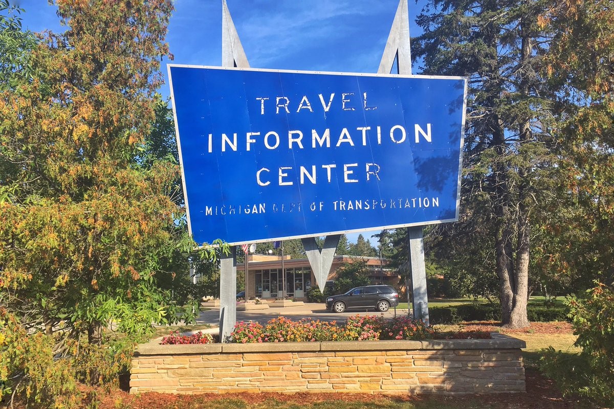 Mackinaw City Travel Information Center sign 2017.jpg – The Mackinaw City Welcome Center sign, last refurbished in 1979, was faded and had peeling lettering.