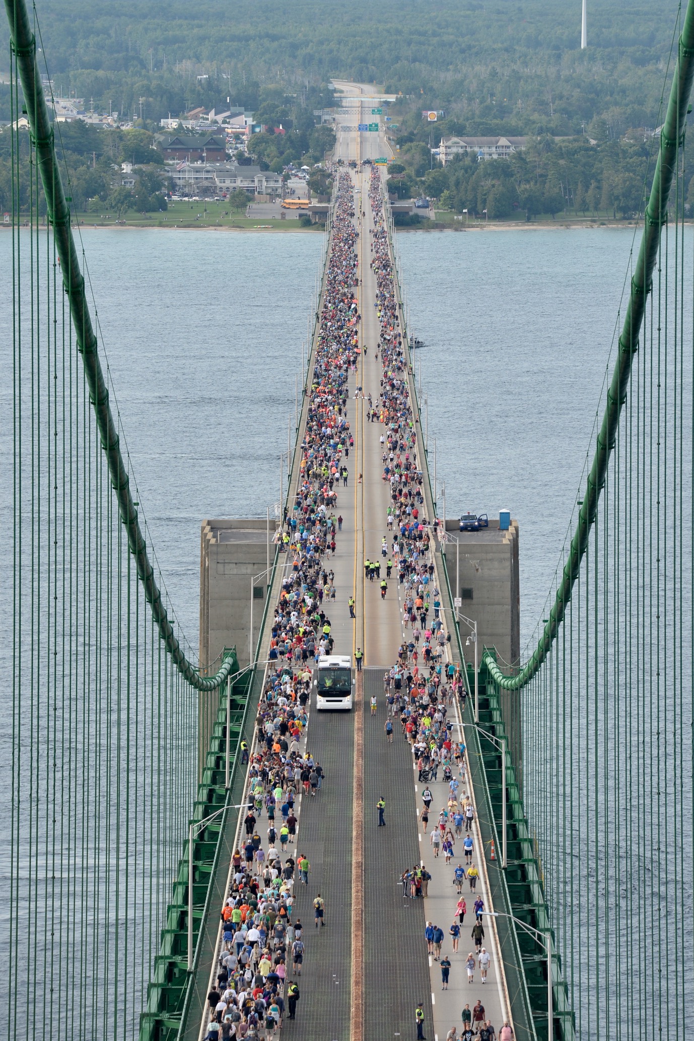 Mackinac Bridge Walk 2018 from south tower – A view of the 2018 Annual Bridge Walk from the Mackinac Bridge south tower. © 2018 MDOT Photography Unit