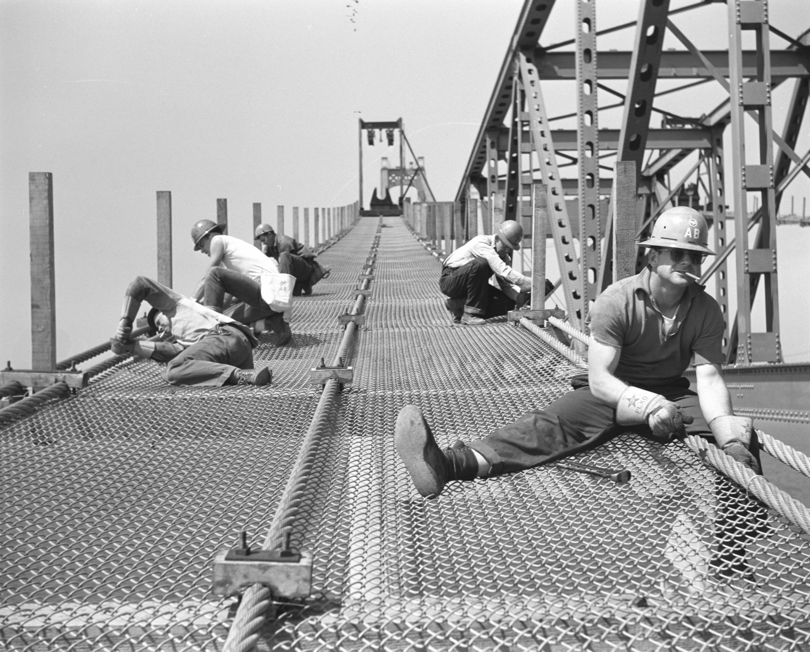 Mackinac Bridge construction, Jack R. Thompson.jpg – Jack R. Thompson, far right, works as part of a crew wiring the mesh to catwalk ropes between piers 17 and 18 on the Mackinac Bridge in 1956. Thompson says it was a pencil in his mouth, “not a smoke.” (H.D. Ellis photo/MDOT archives)