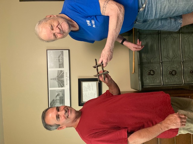 Jack R. Thompson, grating piece.jpg – Jack R. Thompson, right, who worked on the Mackinac Bridge in 1956, receives a piece of the bridge's original steel grating from Bill O'Neil, maintenance director of the Besser Senior Living Community where Thompson now lives.
