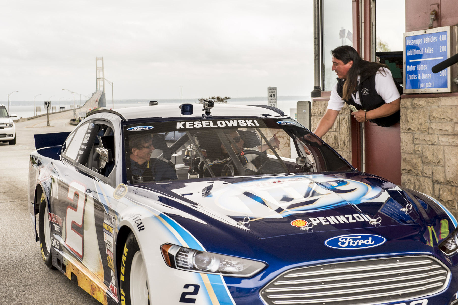 Pat taking Keselowski’s toll.jpg – Pat Rickley collected the toll when 2012 NASCAR Sprint Cup Series champion Brad Keselowski drove his No. 2 Miller Lite Ford across the Mackinac Bridge in 2013.