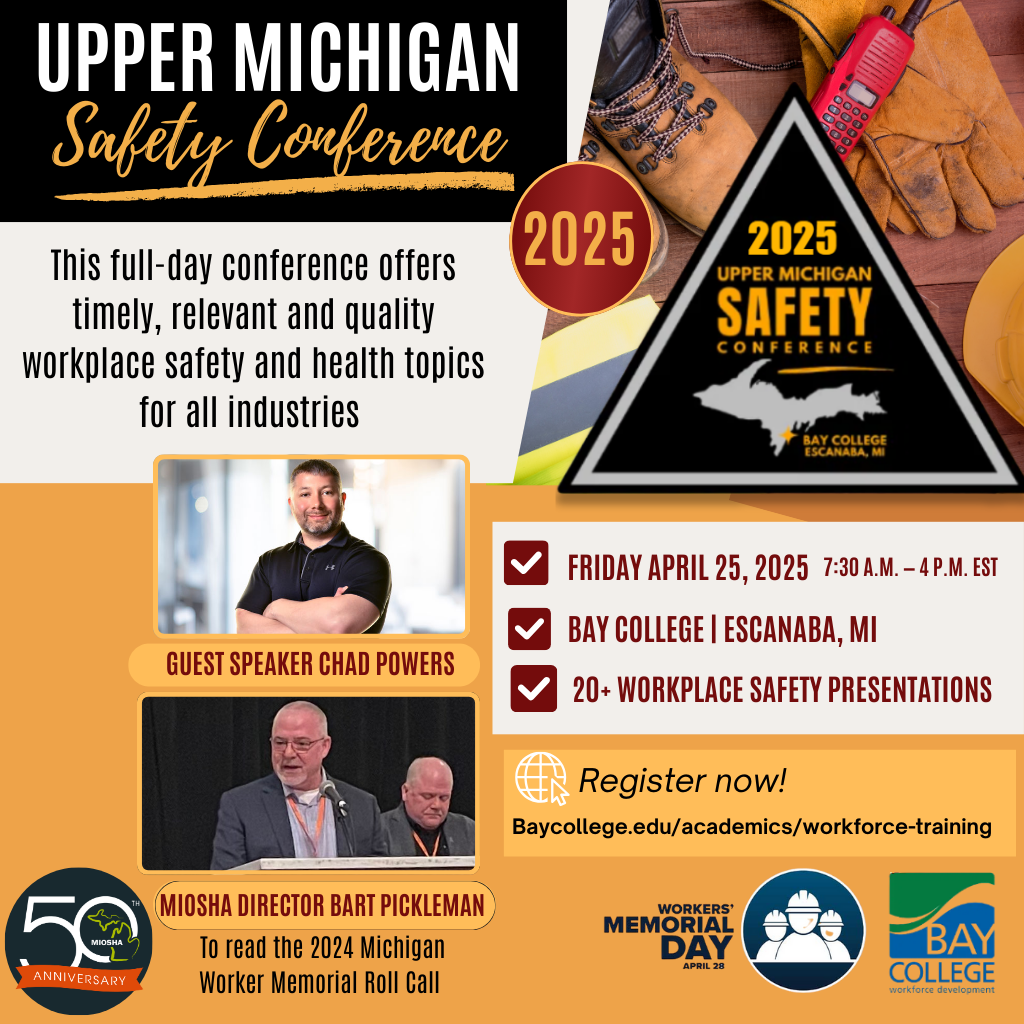 MIOSHA encourages employers and safety professionals from the Upper Peninsula and beyond to attend the 2025 Upper Michigan Safety Conference on Friday, April 25, 2025, from 7:30 a.m. to 4:00 p.m. (EST) at Bay College in Escanaba.