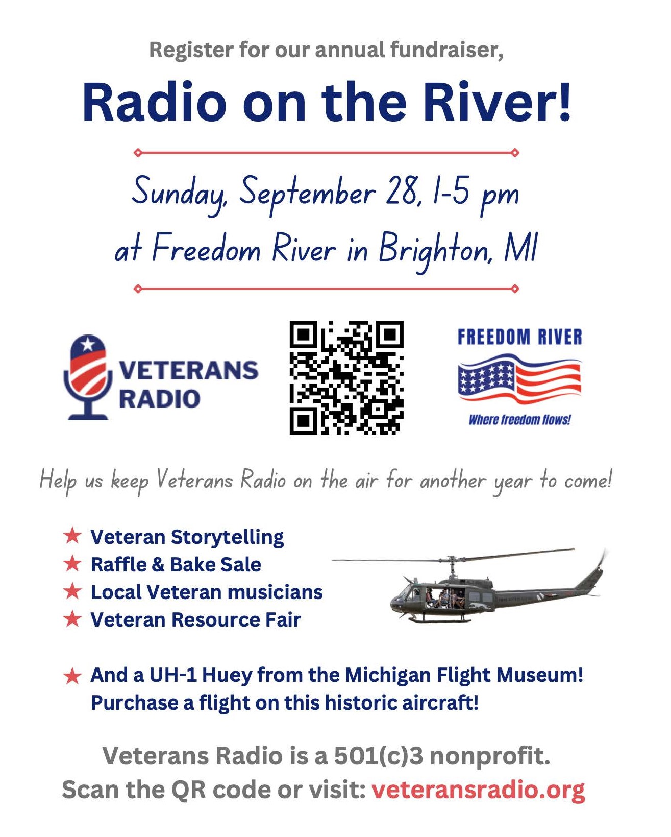 This year's annual fundraiser will take place at Freedom River in Brighton on Sunday, September 28, from 1-5 p.m. We are looking for organizations that could set up info tables as part of our Veteran resource fair during the event. We expect to draw crowds from all over southeast Michigan, with heavy attendance from Washtenaw, Jackson and Livingston counties.