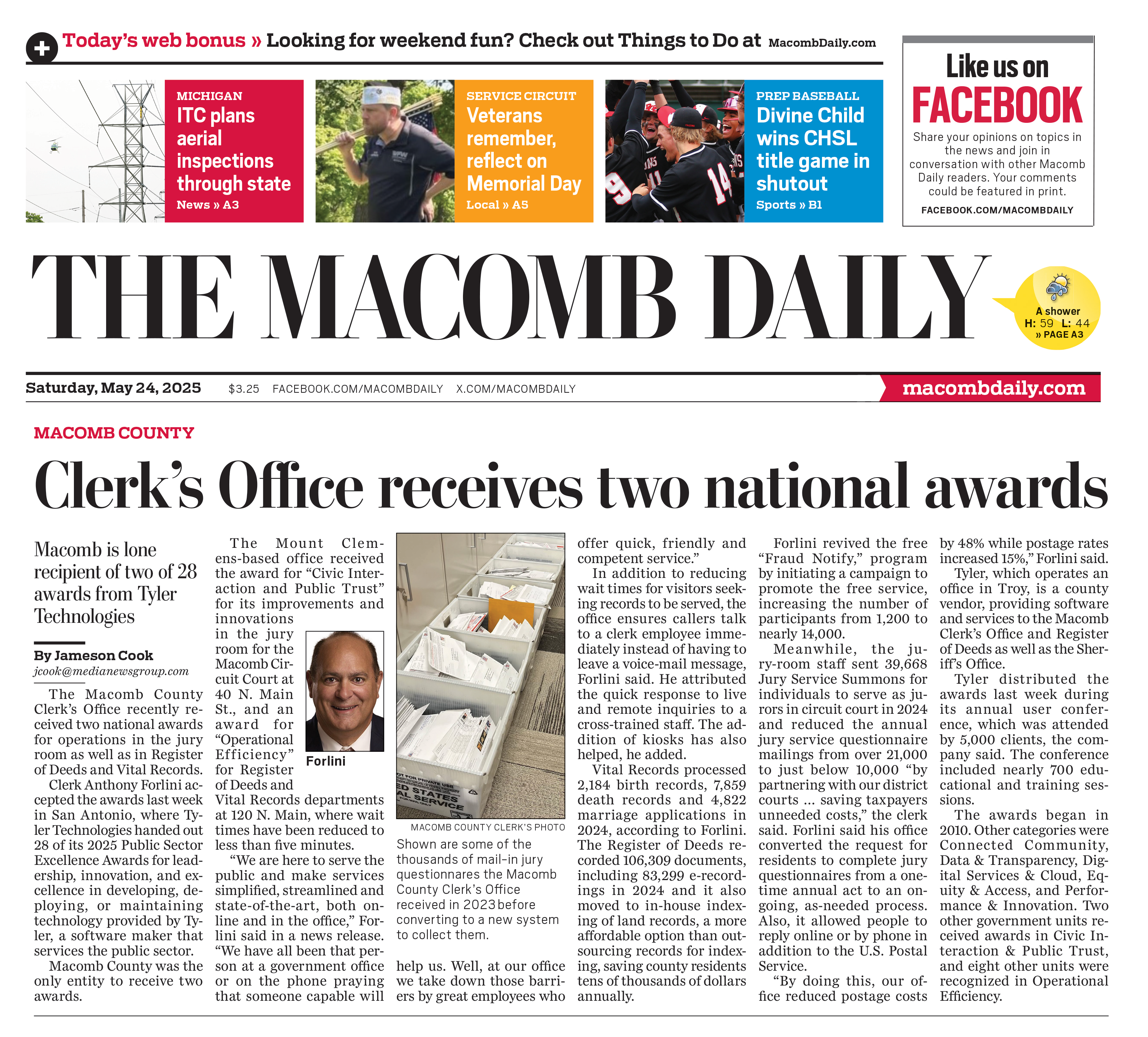 Our Macomb County Clerk’s Office has been selected for two 2025 national awards.