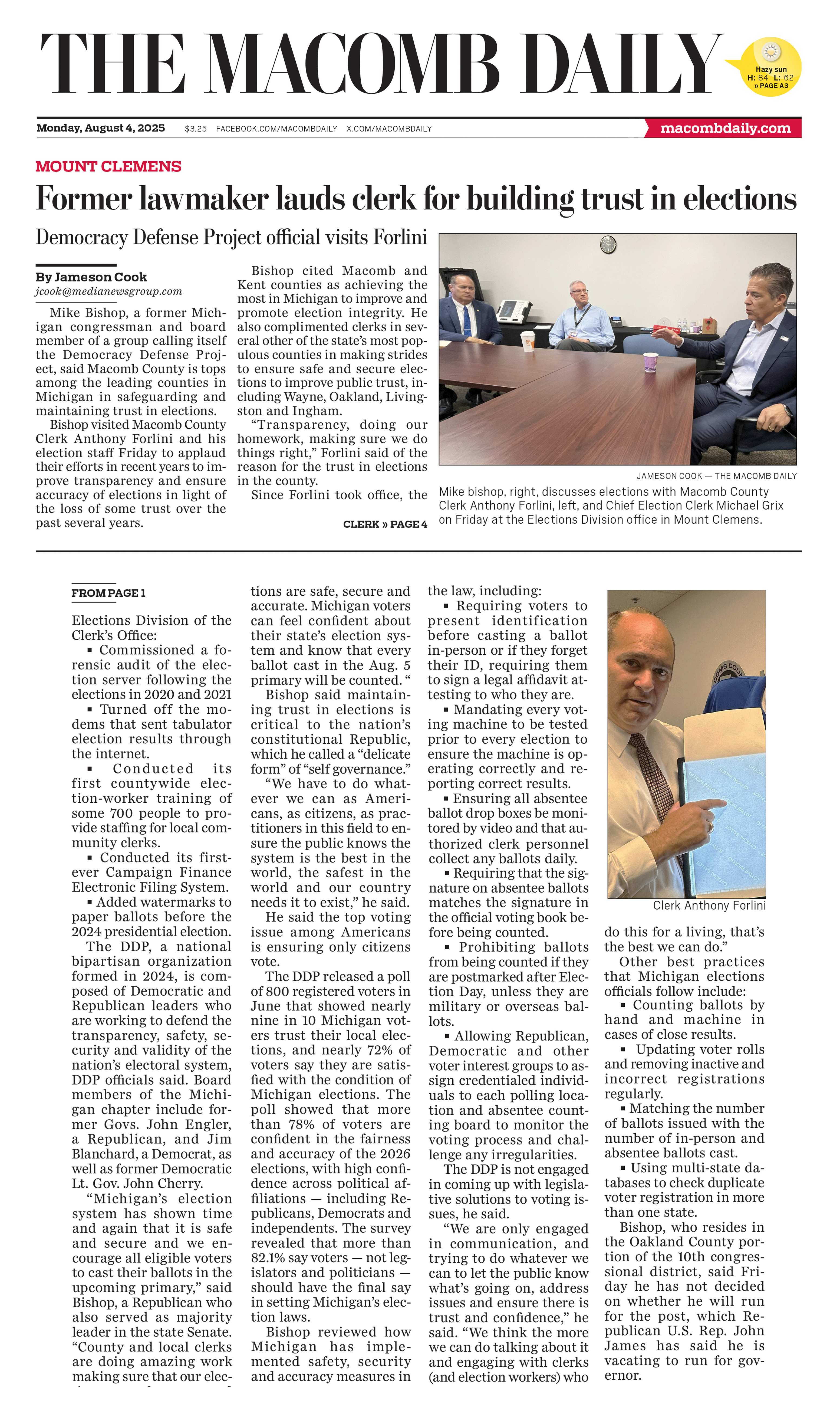 Bishop visited Macomb County Clerk Anthony Forlini and his election staff Friday to applaud their efforts in recent years to improve transparency and ensure accuracy of elections in light of the loss of some trust over the past several years.