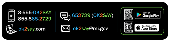 It is important to remember that reporting through the OK2SAY Student Safety Tipline is not sufficient. Proper reports must be submitted directly to CPS via the MDHHS Centralized Intake website or by calling 855-444-3911.