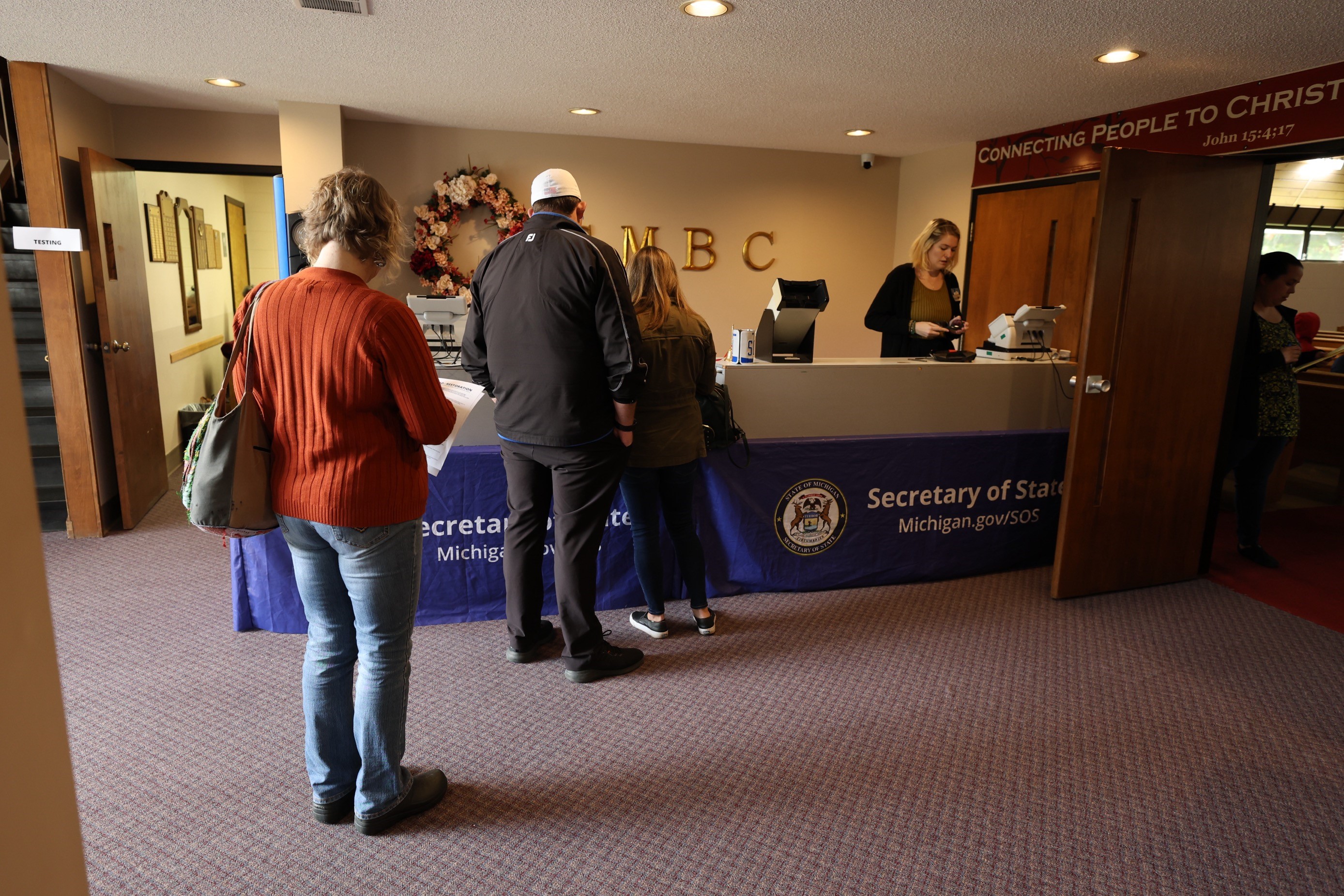 Two Michigan Department of State staff members wait to help the next residents at the Road to Restoration clinic in Battle Creek on Oct. 18, 2023.